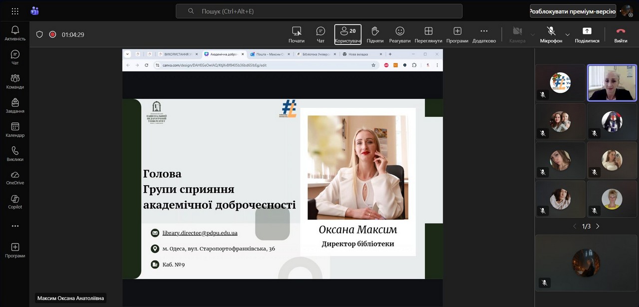 Спікеркою виступила Оксана Максим – директор бібліотеки, Голова Групи сприяння доброчесності в Університеті Ушинського. У межах вебінару учасники ознайомилися з принципами роботи системи перевірки текстів StrikePlagiarism.com, отримали практичні рекомендації щодо коректної інтерпретації звітів подібності, а також обговорили питання етичного використання штучного інтелекту в освітній і науковій діяльності.
