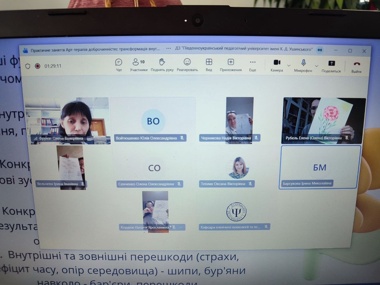 На протязі заняття здобувачі були включенні у процес, задавали питання, ділились досвідом, зацікавились методами арт-терапії.
