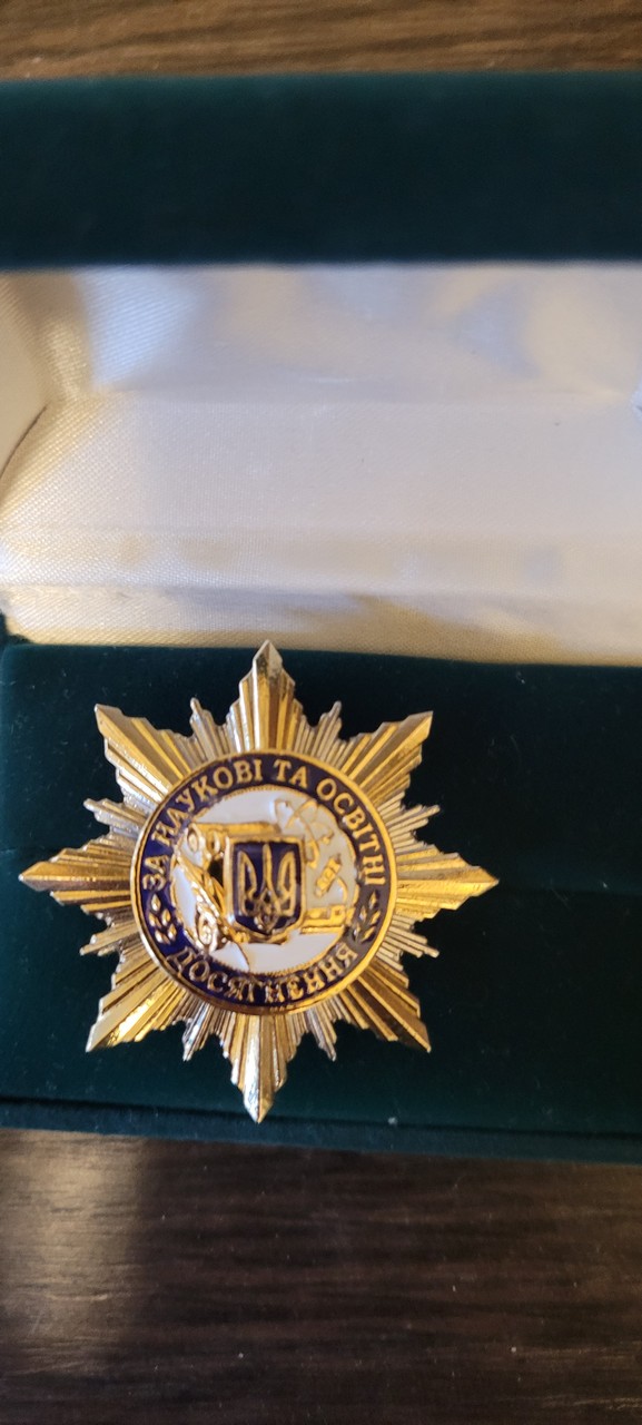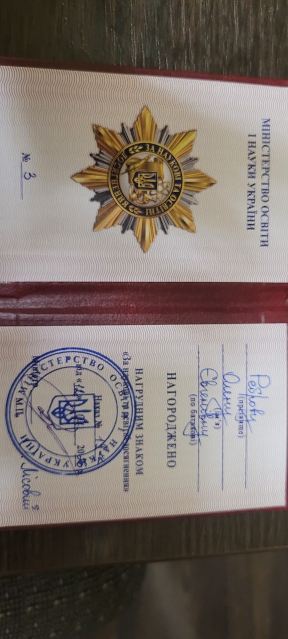 Олена Реброва разом з Нагрудним знаком отримала посвідчення про нагородження за підписом міністра освіти і науки України О.Лісового.