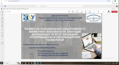 On October 1, 2025, a meeting of the scientific (professional) seminar of Ushynsky University was held under the leadership of Doctor of Pedagogical Sciences, Professor Tetyana Ivanivna Koycheva, at which a discussion of the dissertation research of Natalia Mykolayivna Gudanych on the topic "Development of cognitive initiative of future educators of preschool educational institutions using information and communication technologies" was held.