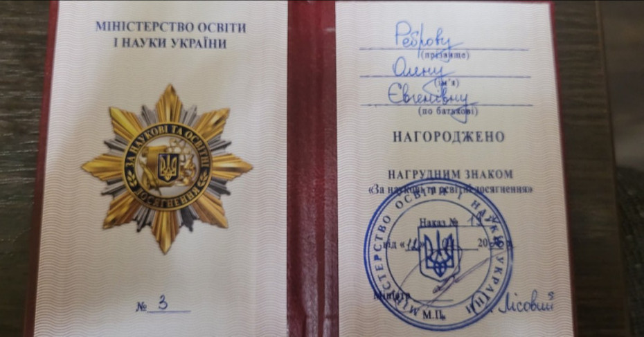 Olena Rebrova, together with the badge, received a certificate of award signed by the Minister of Education and Science of Ukraine O. Lisovy.