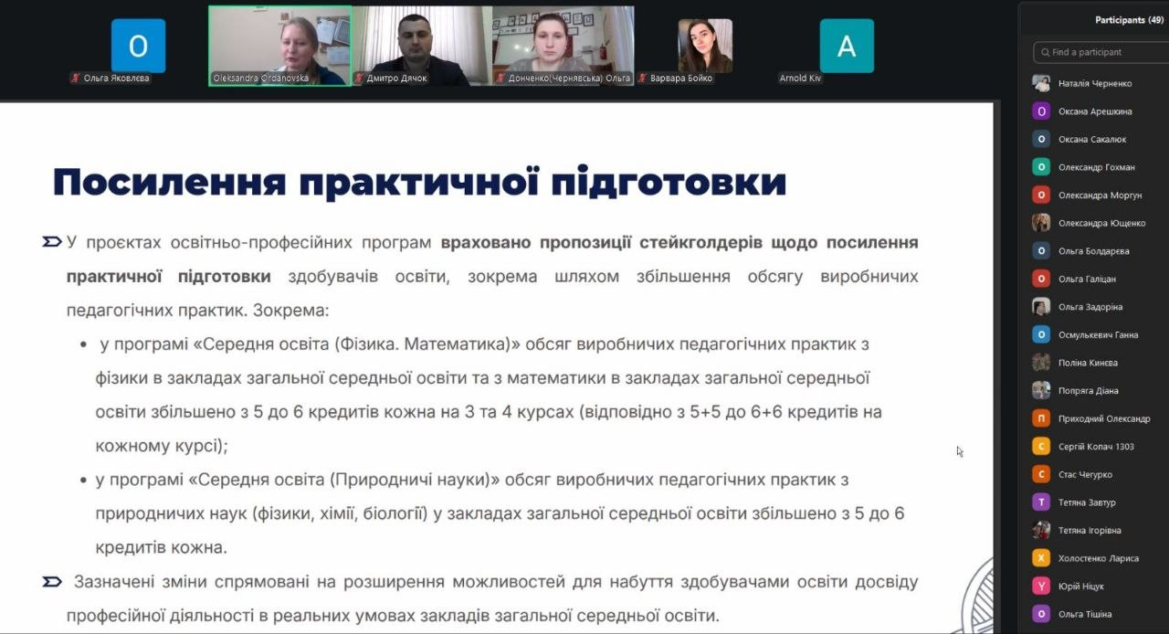 Continuing the discussion of the draft educational and professional programs, Oleksandra Ordanovska, the guarantor of the educational and professional program "Secondary Education (Physics. Mathematics)" of the first (bachelor's) level of higher education, presented the results of the work of the working groups on their revision and updating. It was emphasized that the changes made are aimed, firstly, at strengthening the practical training of education seekers, taking into account the proposals of stakeholders, which was reflected in an increase in the volume of production pedagogical practice and updating its content. Secondly, the formulations of individual program learning outcomes were corrected and clarified for a more transparent and clear correspondence of them to the teacher's labor functions defined in the teacher's professional standard.