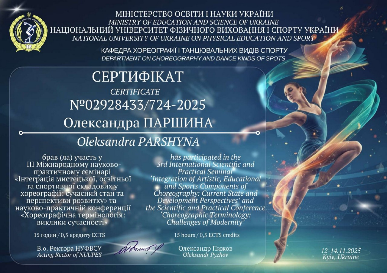 Студентки 3 курсу Олександра Паршина та Лілія Герш стали учасницями ІІІ Міжнародного практичного семінару «Інтеграція мистецької, освітньої та спортивної складових у хореографії: сучасний стан та перспективи розвитку» та у науково-практичній конференції «Хореографічна термінологія: виклики сучасності». Заходи проводилися як єдиний проєкт на кафедрі хореографії і танцювальних видів спорту Національного університету фізичного виховання і спорту України. Наші студентки-хореографи отримали Сертифікати на 15 годин (0,5 кредиту ЕСТS). Це дало змогу перезарахувати теми з ОК 21 «Теорія і методика викладання спортивно-бального танцю».
