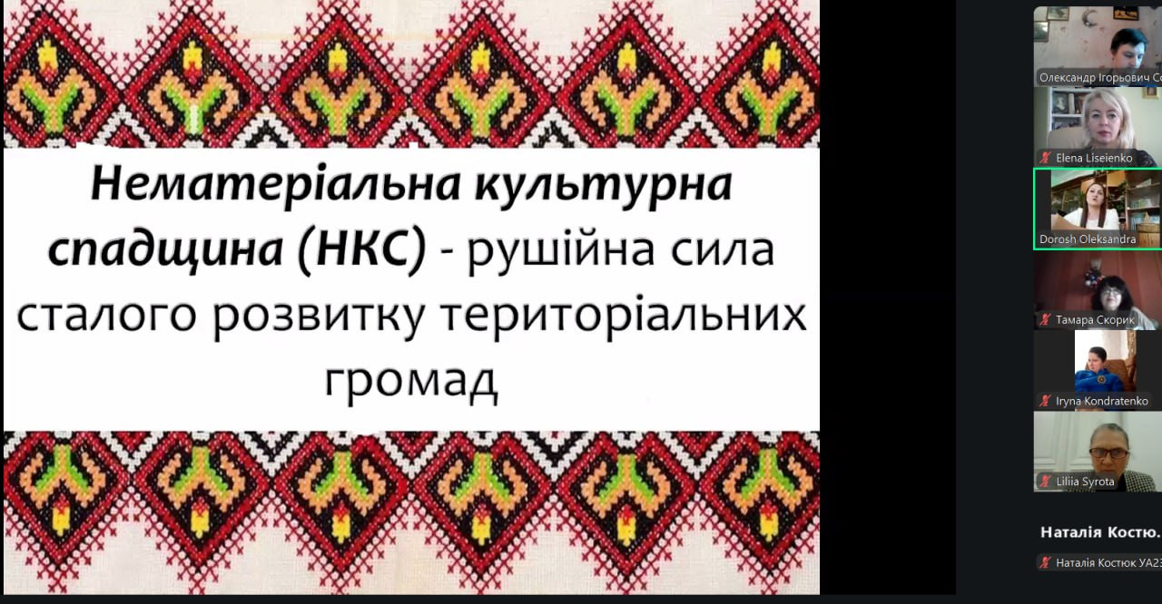 Спікеркою виступила фахівець-практик з галузі культури і мистецтва Дорош Олександра, методист з питань нематеріальної культурної спадщини Комунального закладу «Центр культури та дозвілля» Калинівської міської ради (Вінницька область). Її виступ був цікавим і насиченим реальними кейсами щодо збереження та розвитку нематеріальної культурної спадщини в Калинівській міській ради. Олександра Дорош продемонструвала, як плідна робота з нематеріальною спадщиною формує локальну ідентичність і згуртовує територіальну громаду.