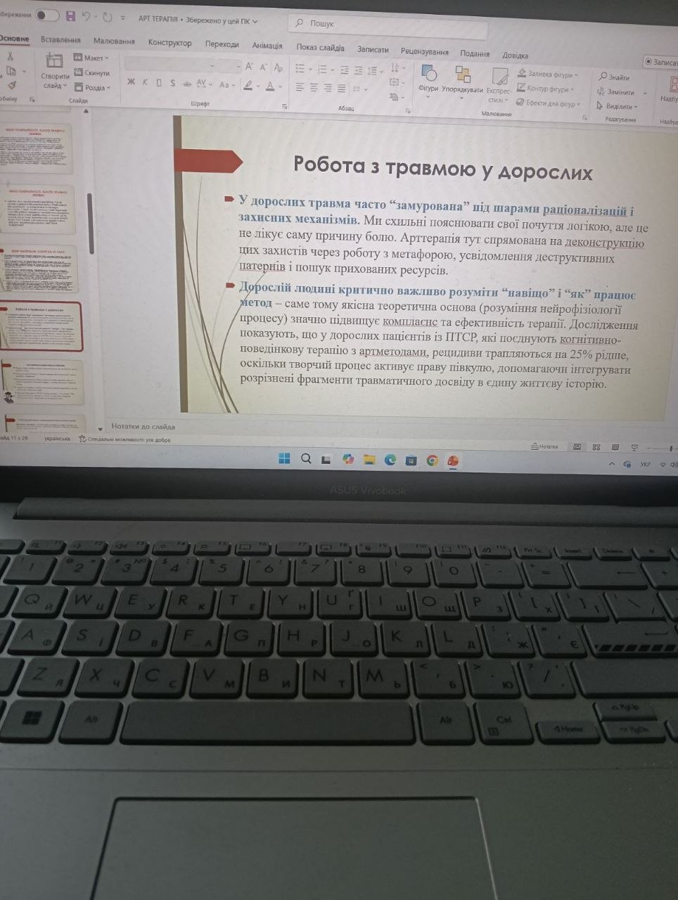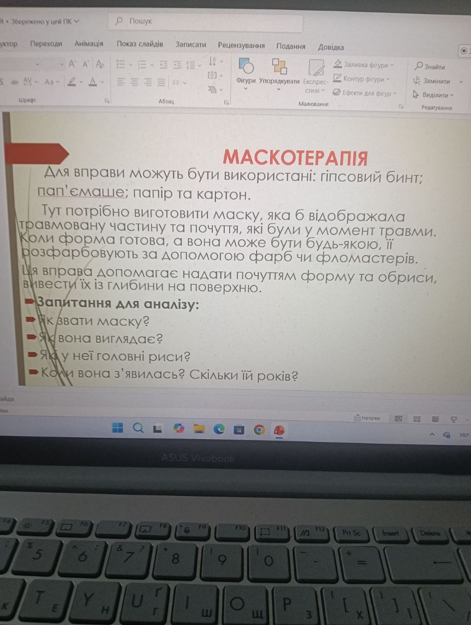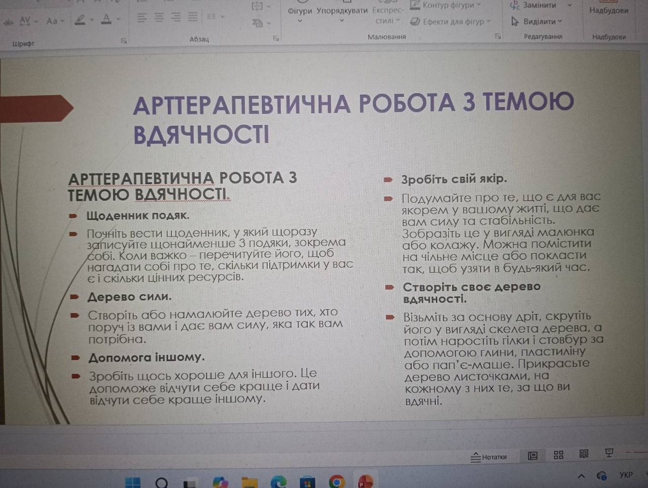 Ключові проблемні питання практичного заняття: робота з травмою, протипоказання до арттерапії.   Доцент кафедри представила арттерапевтичний метод роботи в практиці;  акцентувала увагу, що арттерапія  добре допомагає відреагувати емоцію, прожити ті почуття, які людині складно проявити звичайним способом, а саме: поговорити, описати, розплакатися, розсміятися. Був представлений потужний спектр технік на тілесні відчуття, вправи для заземлення, відчуття тіла, встановлення власних кордонів, який здобувачі відпрацювали під керівництвом спікера.  Відбулося формування навичок маскотерапії,  засвоєно алгоритм проведення даної методики.
