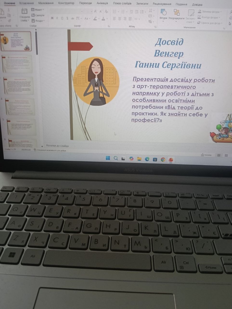 Спікер заходу Венгер Ганна Сергіївна,  кандидат психологічних наук, доцент кафедри клінічної психології та психічного здоров’я, практичний психолог вищої категорії представила свій досвід роботи в цьому напрямку, а саме,  теоретичний блок та практичні кейси практики арттерапії з дітьми з особливими освітніми потребами.