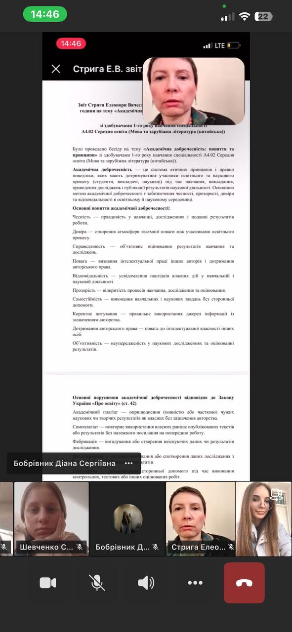 Було проведено бесіду на тему «Академічна доброчесність: поняття та принципи» зі здобувачами 1-го року навчання спеціальності А4.02 Середня освіта (Мова та зарубіжна література (китайська)).