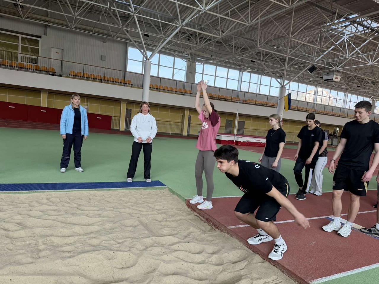 У межах заходу здобувачі освіти мали можливість ознайомитися з комплексом підготовчих і підвідних вправ, спрямованих на поетапне формування техніки виконання стрибка в довжину з розбігу способом «Зігнув ноги». Особлива увага приділялася біомеханічним особливостям руху, раціональній організації розбігу, відштовхування, польотної фази та приземлення, а також типовим помилкам і шляхам їх корекції. Практична частина була побудована за принципами поступовості, варіативності та індивідуалізації навантаження.