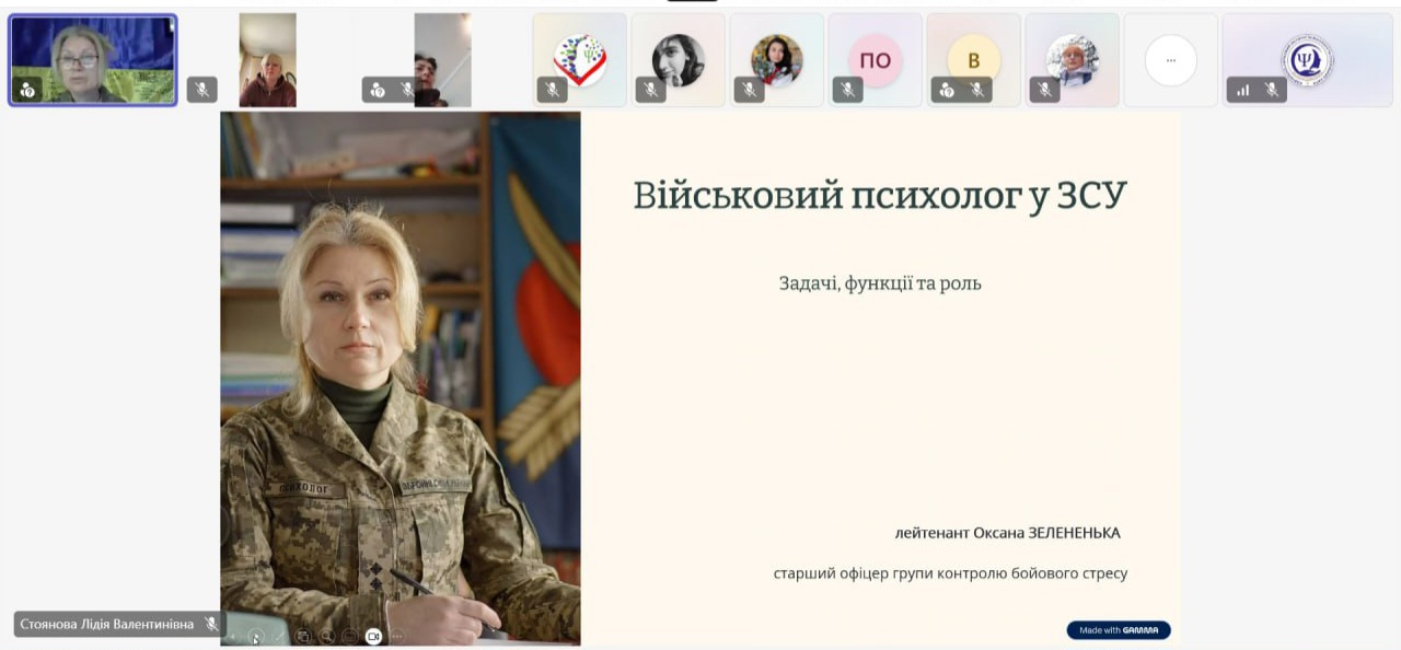 8 березня 2026 року відбулася зустріч на тему: «Військовий психолог у ЗСУ: задачі, функції та роль». Спікеркою заходу стала Оксана ЗЕЛЕНЕНЬКА — лейтенант, старший офіцер групи контролю бойового стресу 39 бригади морської піхоти, яка є випускниця освітньо-професійної програми другого (магістерського) рівня вищої освіти кафедри загальної та диференціальної психології.