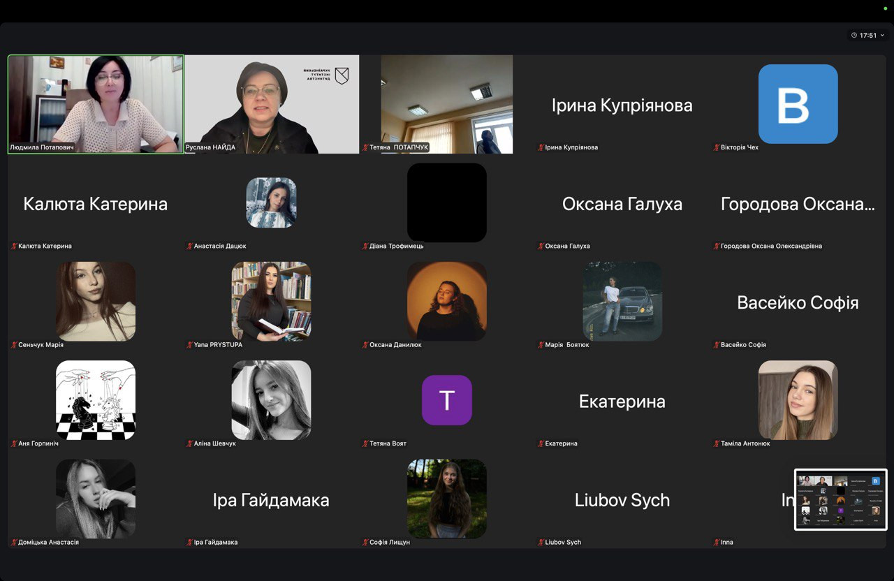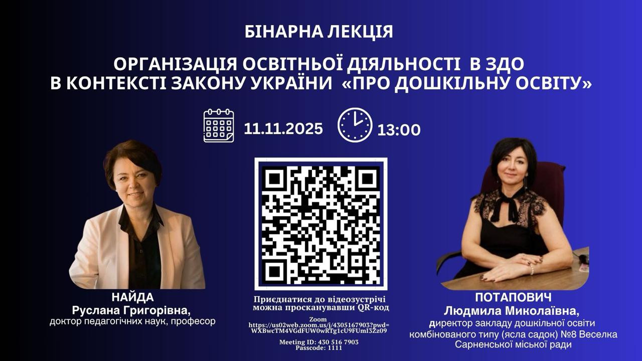 У межах Всеукраїнського Тижня якості освіти на кафедрі теорії та методики дошкільної освіти Державного закладу «Південноукраїнський національний педагогічний університет імені К. Д. Ушинського» відбулася бінарна лекція професора кафедри, докторки педагогічних наук Руслани Найди та директорки закладу дошкільної освіти комбінованого типу (ясла-садок) №8 «Веселка» Сарненської міської ради Людмили Потапович.