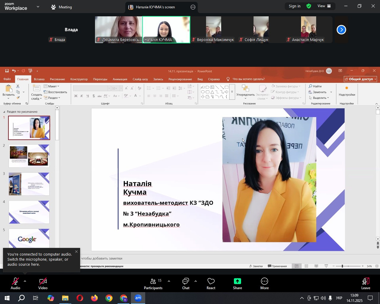 14 листопада 2025 р. у межах опанування освітнього компоненту «Методична робота в ЗДО різного типу» для здобувачів першого (магістерського) рівня вищої освіти освітньо-професійної програми «Дошкільна освіта. Керівник закладу дошкільної освіти» було організовано гостьову лекцію. Спікеркою заходу виступила Кучма Наталія Анатоліївна – вихователь-методист Комунального закладу «Заклад дошкільної освіти № 3 “Незабудка” м. Кропивницького», магістерка спеціальної освіти, фахівчиня вищої кваліфікаційної категорії, а також координаторка освітніх проєктів громадської спілки «Про Дитинство».