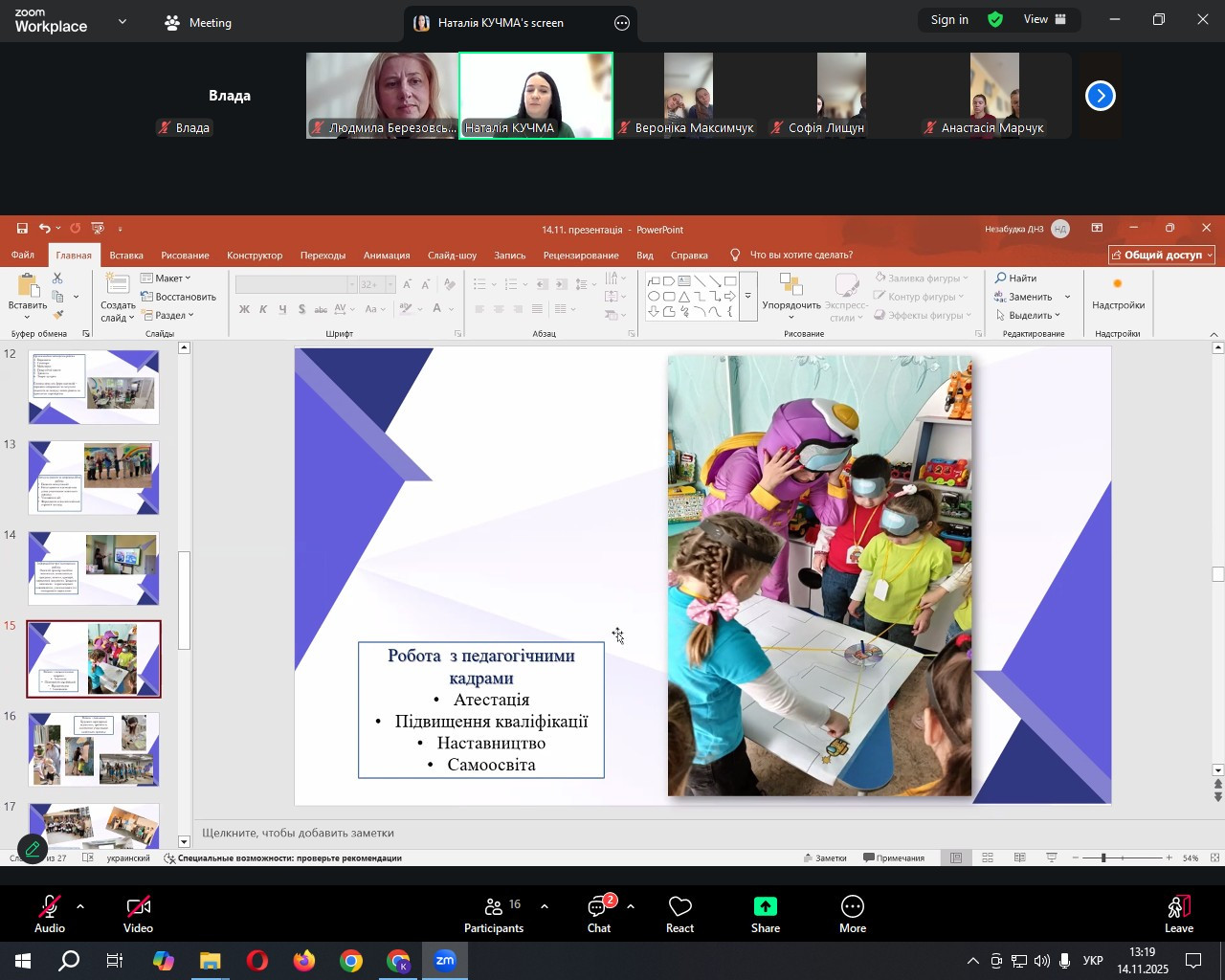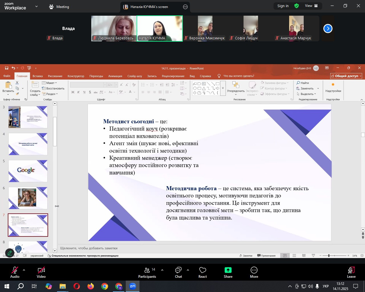 Значну увагу лекторка приділила практичним аспектам організації методичної роботи в ЗДО, поділившись цікавими кейсами з власного досвіду, які стосувалися ефективного управління педагогами, оптимізації їхньої взаємодії, вирішення проблемних ситуацій у професійній діяльності; розповіла про принципи та етапи планування методичної роботи, продемонструвала, як грамотне планування сприяє підвищенню рівня професійної компетентності педагогічного колективу, стимулює до творчого пошуку та впровадження інновацій у освітній процес; навела приклади успішної організації методичних об’єднань, творчих лабораторій, які забезпечують не лише обмін досвідом, а й розвиток креативності, інноваційного мислення та ініціативності у педагогів.
