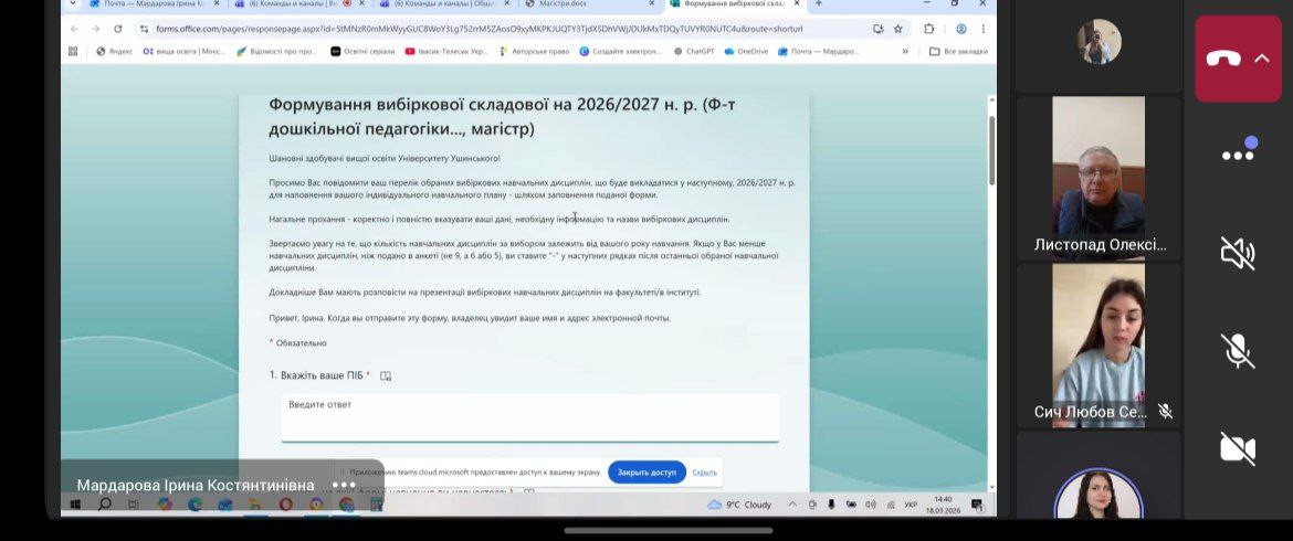 18 березня зі здобувачами вищої освіти першого (бакалаврського) та другого (магістерського) рівнів вищої освіти спеціальності А2 «Дошкільна освіта» було проведено презентацію вибіркових освітніх компонентів. Захід був спрямований на забезпечення поінформованості здобувачів освіти щодо можливостей формування індивідуальної освітньої траєкторії відповідно до їхніх професійних інтересів, освітніх потреб та перспектив подальшої фахової діяльності.