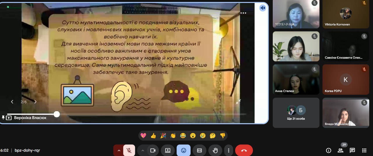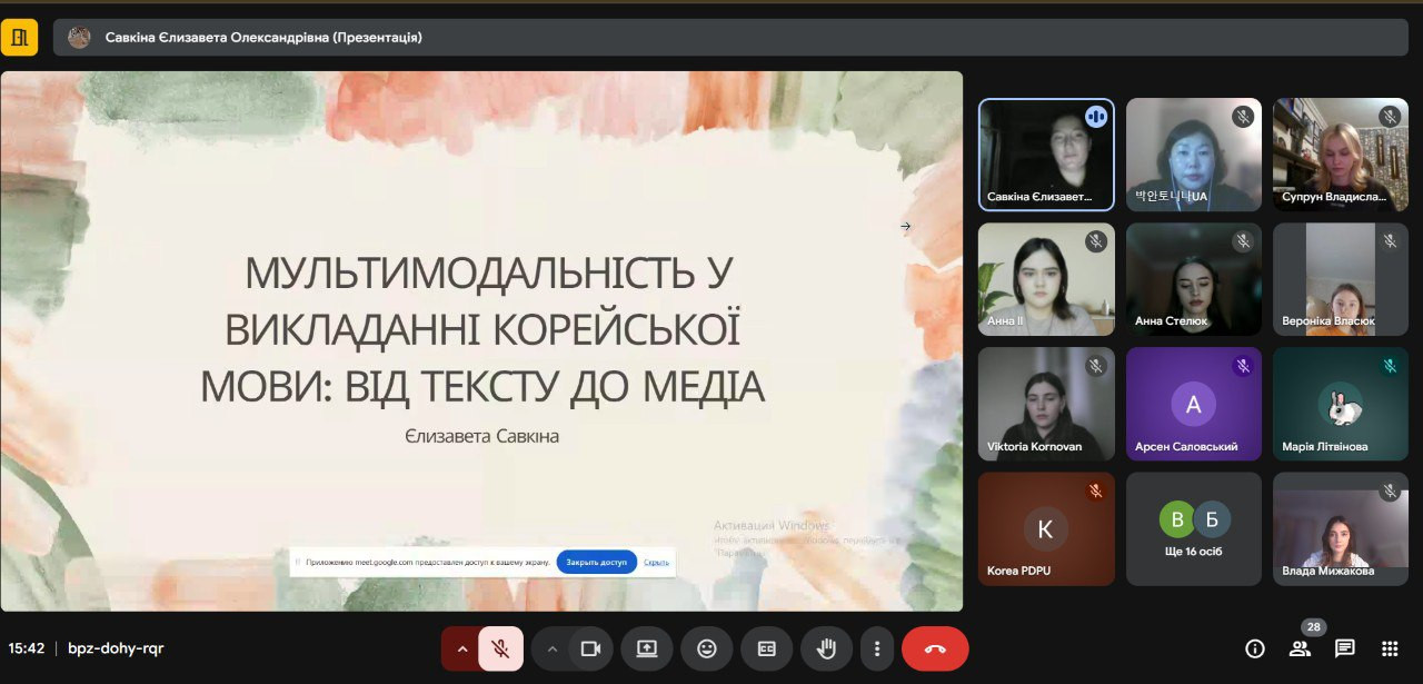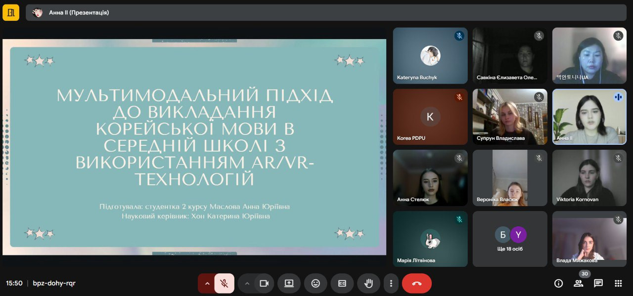 4 грудня 2025 року у межах наукового гуртка “Навчання корейської мови у контексті мультимодального підходу” в онлайн-форматі було проведено студентський круглий стіл, присвячений обговоренню актуальних питань, що відповідають науковій темі кафедри германських і східних мов та методики їх навчання: “Мультимодальність у функціонуванні та викладанні іноземних мов”. Метою заходу стало поглиблення теоретичних знань студентів та розвиток їхніх дослідницьких компетентностей.