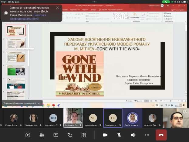 Слід відзначити доповіді з презентацією Павленко Валерії Віталіївни (науковий керівник д.філол.н., проф. Любимова Світлана Анатоліївна), Царюка Дмитра Юрійовича (науковий керівник д.філол.н., проф. Іліаді Олександр Іванович), Чупригіна Артура Геннадійовича (науковий керівник д.філол.н., проф. Іліаді Олександр Іванович), Фу Валерії (науковий керівник к.філол.н., доц. Дерік Ілона Морисівна), Кривої Руслани Ростиславівни (науковий керівник к.філол.н., доц. Дерік Ілона Морисівна), Геращенко Аліни Сергіївни (науковий керівник д.пед.н., проф. Попова Олександра Володимирівна) та Чжан Чи (науковий керівник д.пед.н., проф. Попова Олександра Володимирівна). Всі ці здобувачі вищої освіти захистили магістерські роботи на «відмінно». Окремо слід звернути увагу, на той факт, що Чупригін А.Г. наразі перебуває у лавах ЗСУ, а Чжан Чи знаходиться на академічній мобільності у Харбінському інженерному університету і нещодавно отримала нагороду “Special Contribution Award”.
