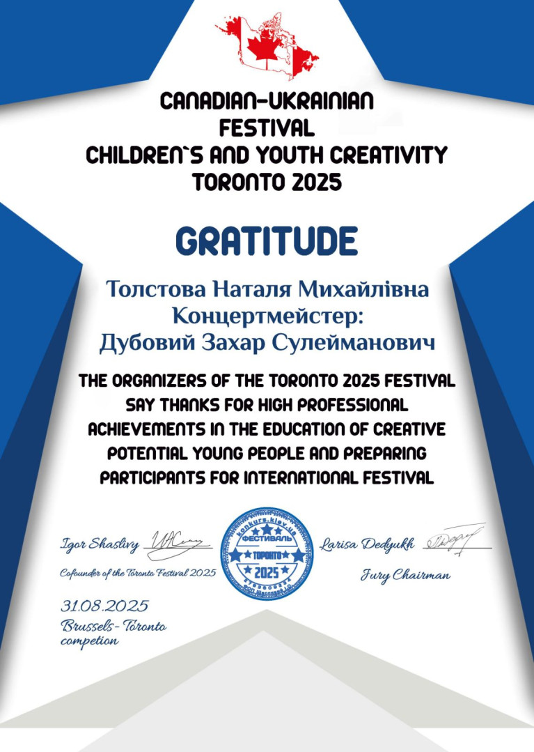 Журі високо оцінило її виконавську майстерність та глибоке відчуття стилю, особливо відзначивши філігранне виконання арії Альцини з однойменної опери Г. Ф. Генделя. Невід'ємною частиною цього успіху став бездоганний фортепіанний супровід, забезпечений концертмейстером кафедри теоретичної, музично-інструментальної та вокальної підготовки Захаром ДУБОВИМ. Здобувачка Навчально-наукового інституту музичного і перформативного мистецтва та соціокультурних практик Аріна Семенісова стала лауреатом І премії у номінації «Академічний вокал» на Канадсько-Українському фестивалі «Торонто 2025».