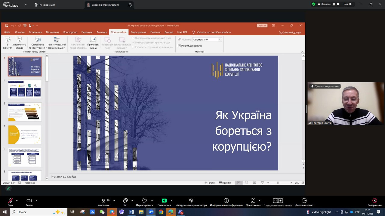 6 листопада 2025 року на запрошення кафедри політичних наук і права науково-педагогічні працівники кафедри, аспіранти ОНП «Філософія» (Ігор Усатюк, Микола Начев, Неля Чабан), магістранти ОНП «Філософія бізнесу та соціокультурних практик» (Анастасія Даниленко, Каміла Калаєва, Павло Козленко) та студенти ОПП «Менеджмент соціокультурної діяльності» (Поздняя Даша, Луцик Ярослава, Денис Будяченко) відвідали відкриту гостьову лекцію на тему «Запобігання корупції в умовах війни: нові досягнення та виклики». Спікером виступив к. ю. н., доцент, заступник керівника відділу реалізації політики у сфері правопорядку Управління реалізації антикорупційної політики у сферах економіки та правопорядку НАЗК – Григорій Усатий, фахівець із практичним досвідом у сфері державного управління. У межах зустрічі було розглянуто напрями діяльності НАЗК, специфіку реалізації антикорупційних практик в умовах воєнного стану, зокрема щодо моніторингу способу життя посадових осіб, а також досягнення України у сфері запобігання та протидії корупції. Особливу увагу лектор приділив значенню просвітницької та освітньої діяльності агентства – створенню сучасних навчальних продуктів у форматі неформальної освіти для публічних службовців і громадян. Також наголошувалося на важливості міжсекторальної взаємодії – співпраці з громадськими організаціями, освітніми закладами та медіа з метою формування культури доброчесності та прозорості в суспільстві. Подія засвідчила актуальність антикорупційної освіти як складової професійних і громадянських компетентностей сучасних здобувачів вищої освіти.