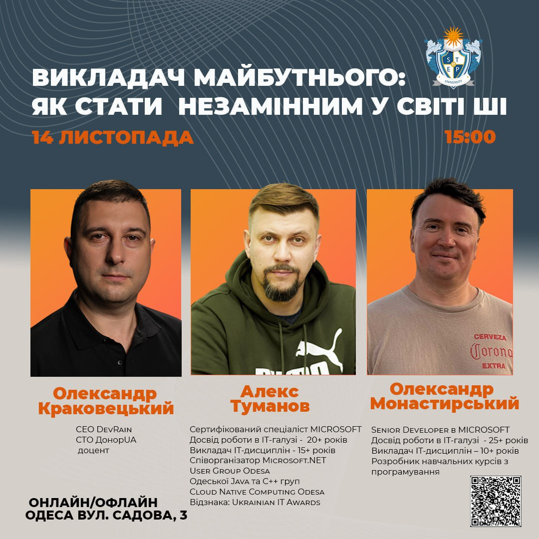 - Алекса Туманова – сертифікованого спеціаліста Microsoft, експерта з хмарних технологій та .NET-розробки;