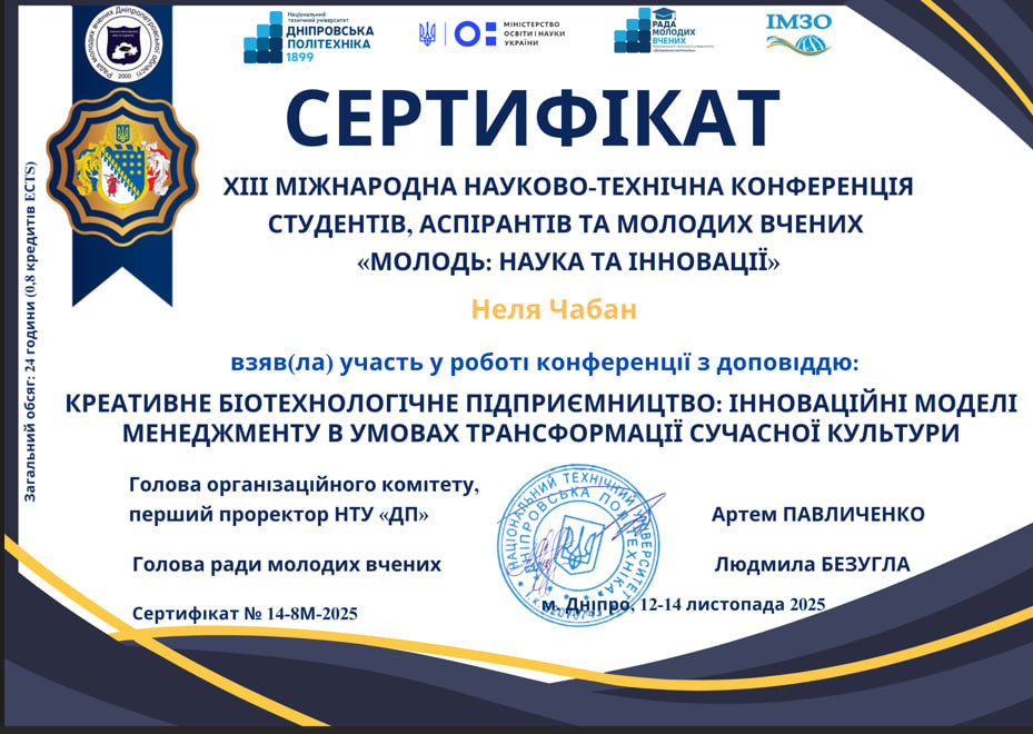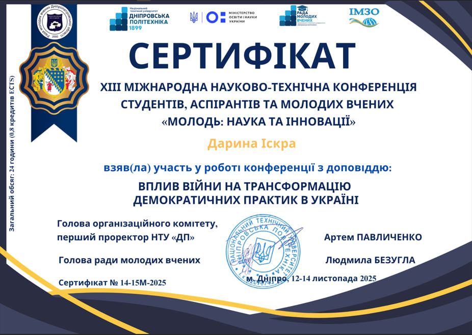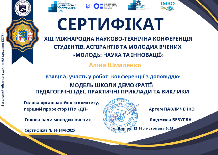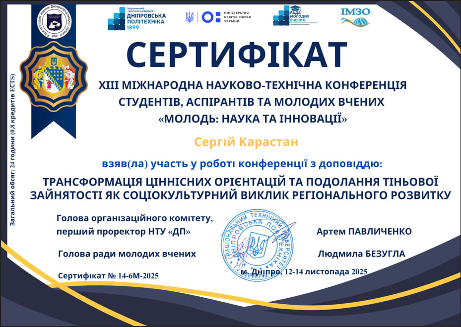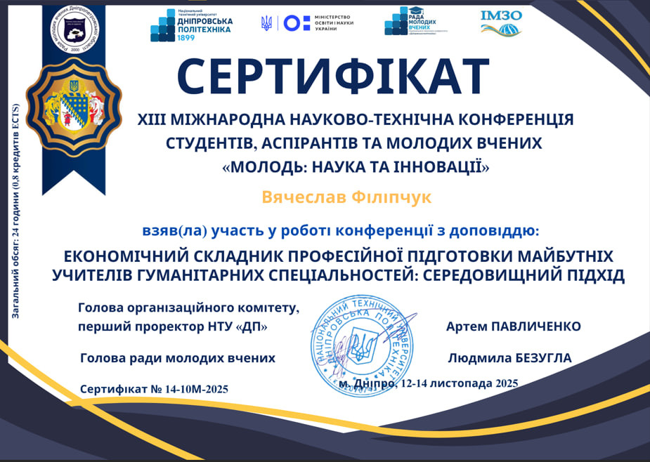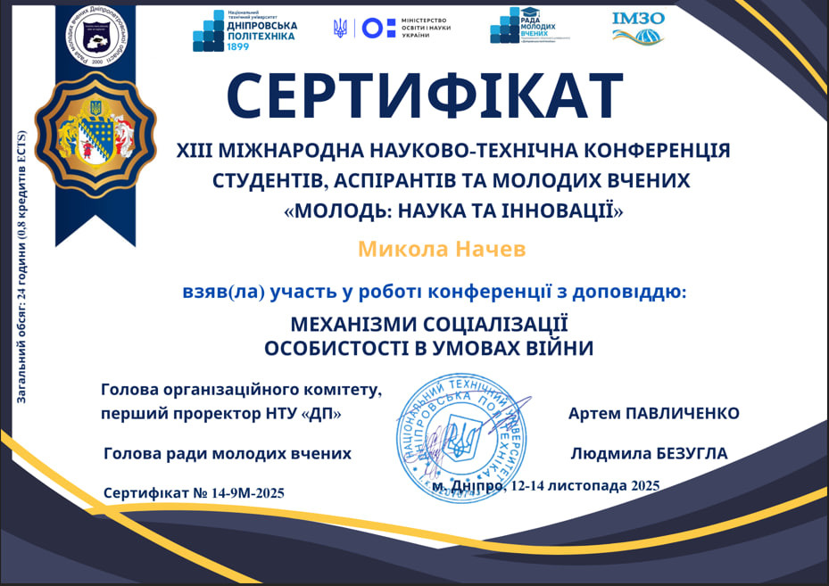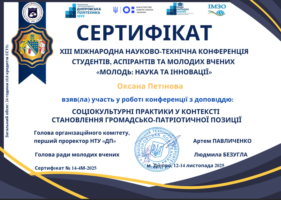 12–14 листопада 2025 року відбулася ХІІІ Міжнародна науково-технічна конференція студентів, аспірантів та молодих учених «Молодь: наука та інновації» (м. Дніпро), до якої на запрошення ЗВО-партнера НТУ «Дніпровська політехніка» долучилися здобувачі вищої освіти нашого університету, в тому числі аспіранти ОНП «Філософія» Неля Чабан, Сергій Карастан, Микола Начев, Ігор Усатюк, Віолета Світлицька, а також члени студентського наукового гуртка «Південноукраїнські наукові студії» (керівник – проф. Оксана Петінова) – Оксана Базелюк, Аліна Шмаленко, Каріна Мусіхіна, Дарина Іскра та інші. Цей захід став важливою платформою для академічного зростання молодих дослідників та обміну науковими ідеями в умовах сучасних суспільних трансформацій. Участь у конференції сприяла презентації наукових результатів та розвитку дослідницької культури й академічної комунікації учасників. У межах секції № 14 «Гуманітарні науки» представлено широкий спектр тем, що відображають актуальні соціокультурні, філософські, педагогічні та економічні виклики сучасності. Зокрема, студентські та аспірантські доповіді були присвячені проблемам формування громадянсько-патріотичної позиції, трансформації ціннісних орієнтацій, ролі мистецтва метамодерну, впливу війни на демократичні практики та соціалізацію особистості, розвитку демократичного освітнього середовища, креативного підприємництва й педагогічних стратегій підтримки молоді в умовах кризи. Проведення конференції ще раз підтвердило, що наукові заходи такого формату є важливим середовищем професійної соціалізації студентів і аспірантів, сприяють розвитку наукової ініціативи, академічної доброчесності та формуванню активної дослідницької позиції молоді.