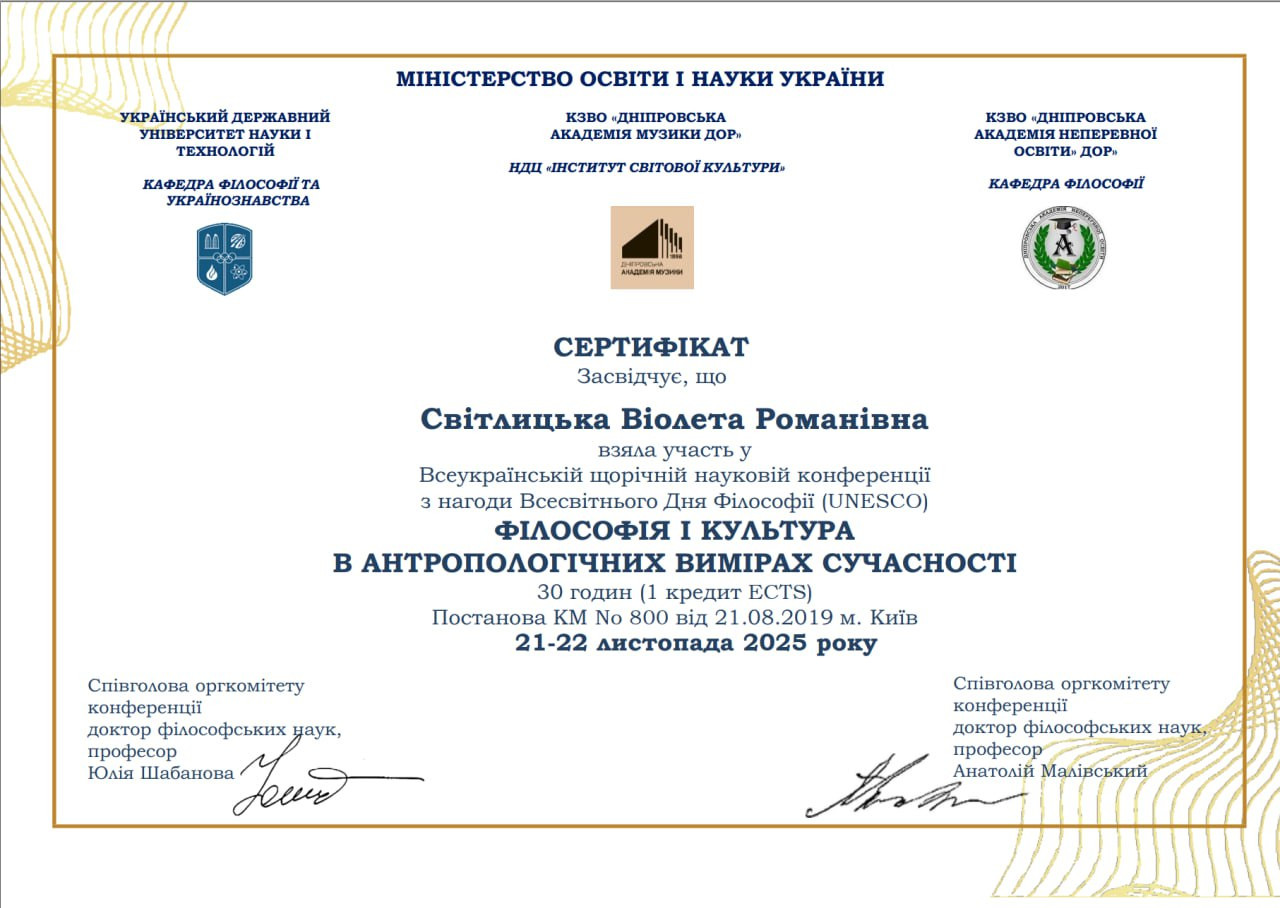 20–21 листопада 2025 року відбулася щорічна наукова конференція «Філософія і культура в антропологічних вимірах сучасності», приурочена до Всесвітнього Дня філософії (UNESCO). Модераторка заходу – проф. Юлія Шабанова, директорка НДЦ «Інститут світової культури», КЗВО «Дніпровська академія музики ДОР» (ЗВО-партнер). Захід об’єднав науковців та здобувачів освіти із різних ЗВО та наукових інституцій. Конференція стала важливою платформою для міждисциплінарного діалогу, обміну науковими ідеями та осмислення актуальних викликів сучасності крізь призму філософії та культури. У межах конференції виступили відомі науковці, які виступили з доповідями, що торкалися актуальних питань філософської антропології, етичних запитів сучасної філософії, соціального виміру людського буття в часі війни та інших.