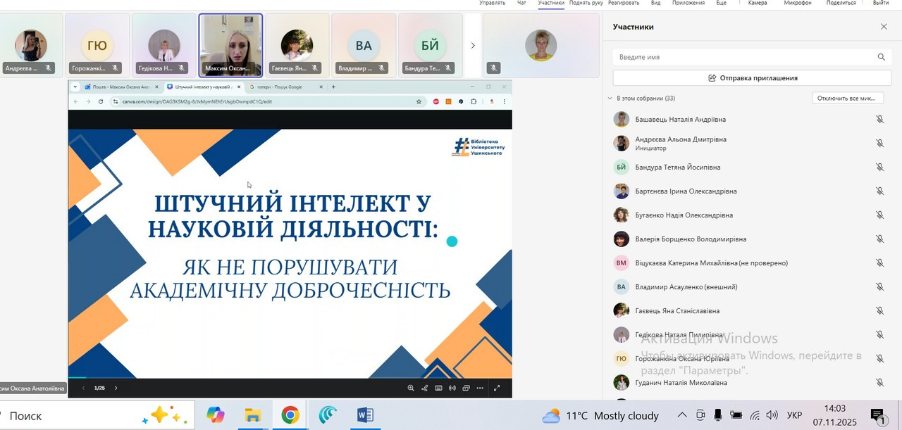 7 листопада 2025 р. здобувачі вищої освіти, які навчаються за другим (магістерським) рівнем ОПП Середня освіта (Фізична культура) відвідали лекцію з теми «ШІ у науковій діяльності: як не порушувати академічну доброчесність», яку проводила директор бібліотеки Університету Ушинського Максим Оксана.