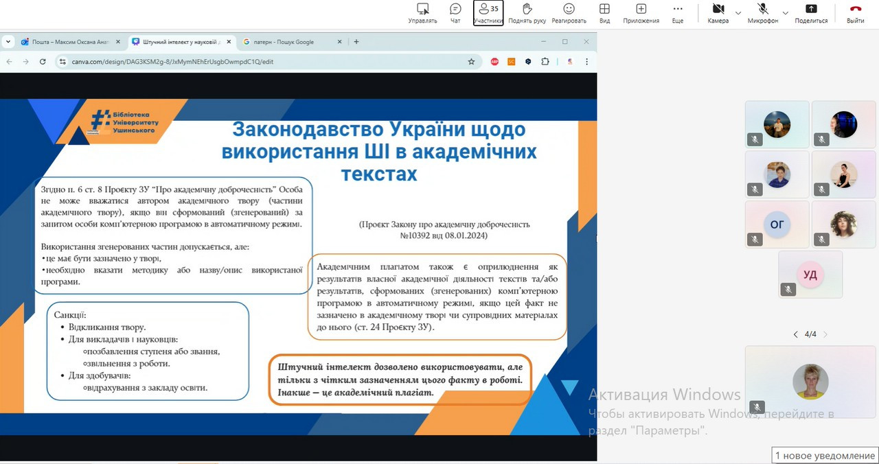 У межах лекції розглядалися основні напрями застосування ШІ в науковій діяльності, переваги та потенційні ризики його використання. Окрему увагу приділено етичним аспектам взаємодії з інтелектуальними системами, правилам посилання на матеріали, створені за допомогою ШІ, та практичним рекомендаціям щодо забезпечення прозорості й відповідальності в наукових роботах.