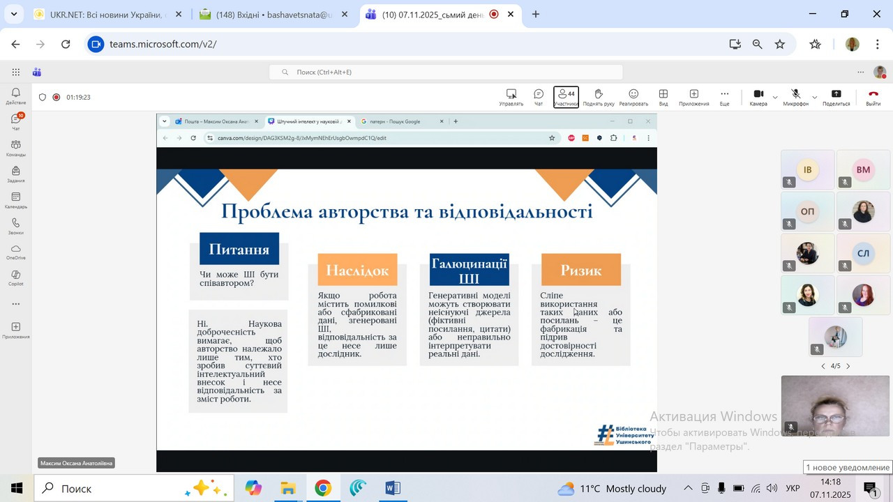 Максим Оксана довела, що сучасний розвиток штучного інтелекту (ШІ) відкриває нові можливості для здобувачів, освітян та науковців у зборі, аналізі та обробці даних, підготовці магістерських робіт, публікацій і підвищенні ефективності досліджень. Водночас активне використання таких технологій ставить питання дотримання принципів академічної доброчесності, зокрема уникнення плагіату, фальсифікацій та неналежного авторства.
