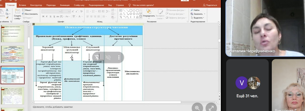 Спікер - кандидат педагогічних наук, доцентка кафедри логопедії та логопсихології Українського державного університету імені Михайла Драгоманова Чередніченко Наталія Володимирівна, яка представила надзвичайно цікавий, фундаментальний, структурований лекційний матеріал за темою порушень писемного мовлення у дітей з тяжкими порушеннями мовлення та у структурі більш складних деструктивних розладів. Було розкрито основні питання діагностики, труднощі засвоєння шкільних навичок, специфічні порушення письма та читання, розкрито зміст комплексного підходу до корекційно-розвивального навчання з дітьми. Було надано багато практичного матеріалу з власного досвіду. Лекція мала бінарний характер, оскільки питання, що розглядались викликали надзвичайну зацікавленість і спонукали до діалогу, додаткових питань діагностики та корекції. Здобувачі мали змогу висловити власні думки, а також зробити змістовні висновки.