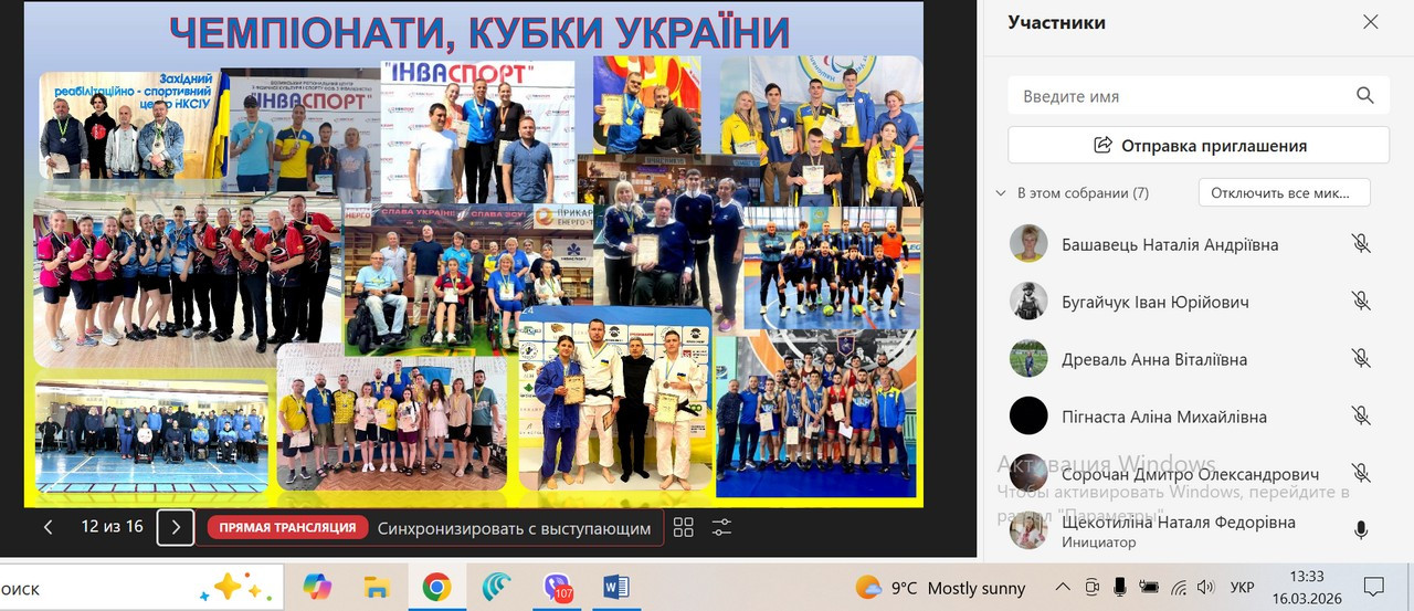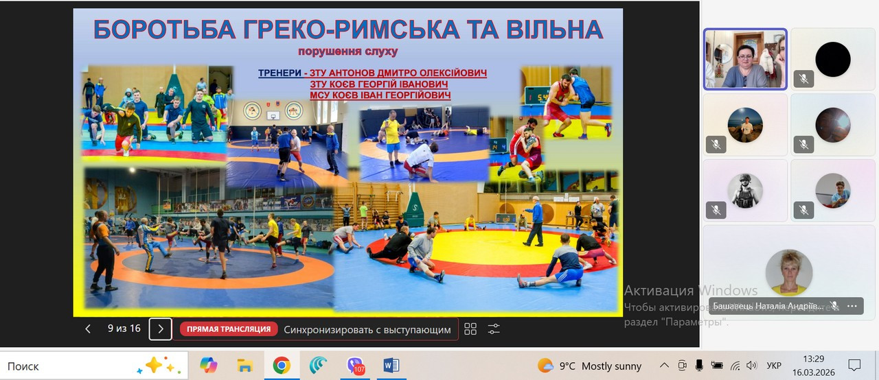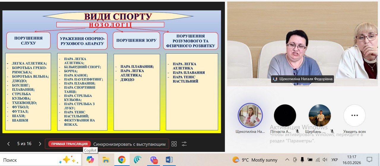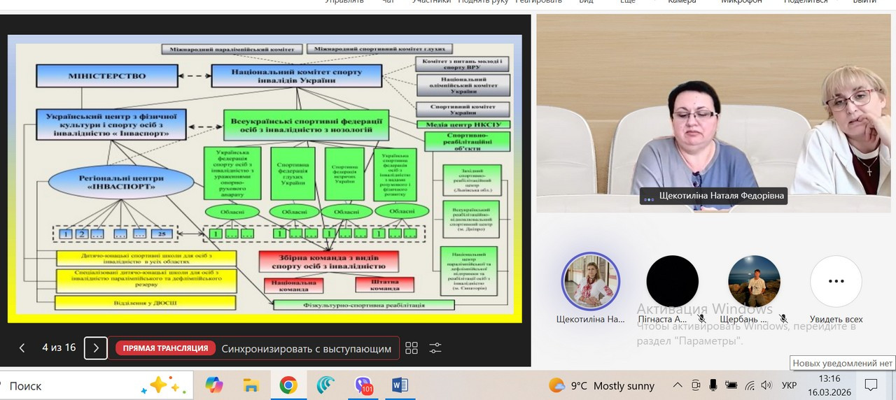 16 березня 2026 року відбувся гостьовий вебінар “Інклюзія у спорті” з дисципліни “Інклюзія у фізичній культурі” зі здобувачами ОПП Середня освіта (Фізична культура) другого магістерського рівня, присвячений сучасним підходам до інклюзії у сфері фізичної культури. Вебінар проводили ГАВРУШЕНКО Галина Іванівна – заступник начальника Одеського РЦ "Інваспорт" та САМАРІНА Наталя Дмитрівна – головний фахівець, перекладач жестової мови, а також доцент кафедри гімнастики та фізкультурно-спортивних технологій ЩЕКОТИЛІНА Наталя Федорівна.