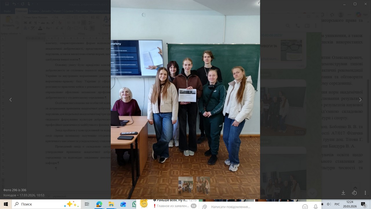 16 березня 2026 року, в рамках Тижня академічної доброчесності старший викладач Дишель Галина Олександрівна провела зустріч зі студентами кураторської групи у форматі кейс-сесії за темою: «Таксономія порушень академічної доброчесності в освітньому середовищі».