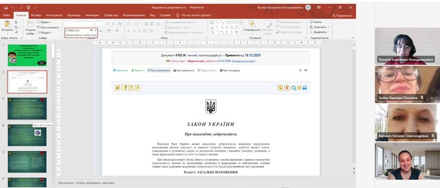 Під час зустрічі учасники обговорили питання академічної доброчесності, правового захисту результатів інтелектуальної діяльності, етичних принципів та відповідальності науковця в сучасному освітньому просторі.