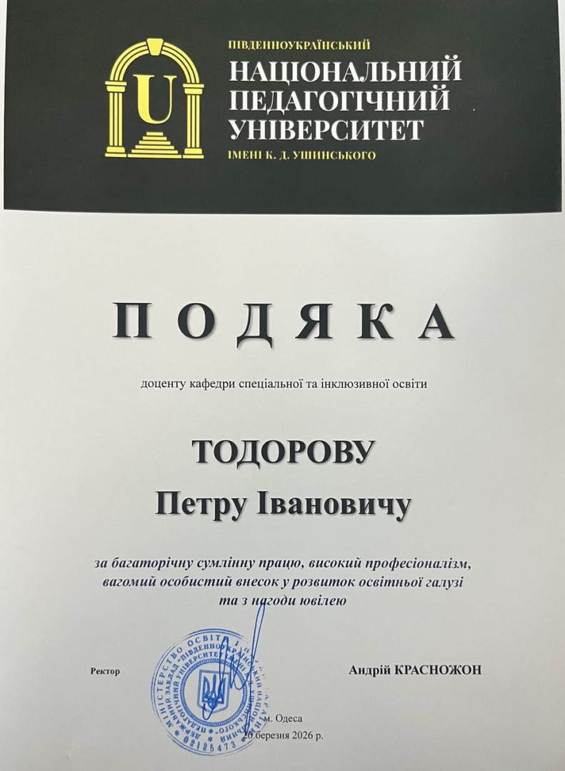 Вітаємо доцента кафедри, майстра спорту, заслуженого працівника фізичної культури і спорту України Тодорова Петра Івановича з нагоди отримання подяки за багаторічну сумлінну працю, високий професіоналізм, вагомий особистий внесок у розвитку освітньої галузі та з нагоди ювілею.