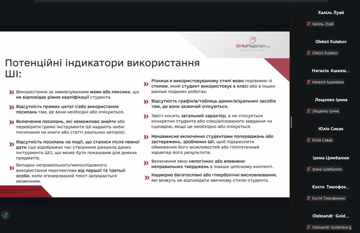 Учасники отримали корисну інформацію щодо використання системи StrikePlagiarism.com у практиці забезпечення академічної доброчесності в Університеті Ушинського, а також навички як зробити ШІ-контент оригінальним.