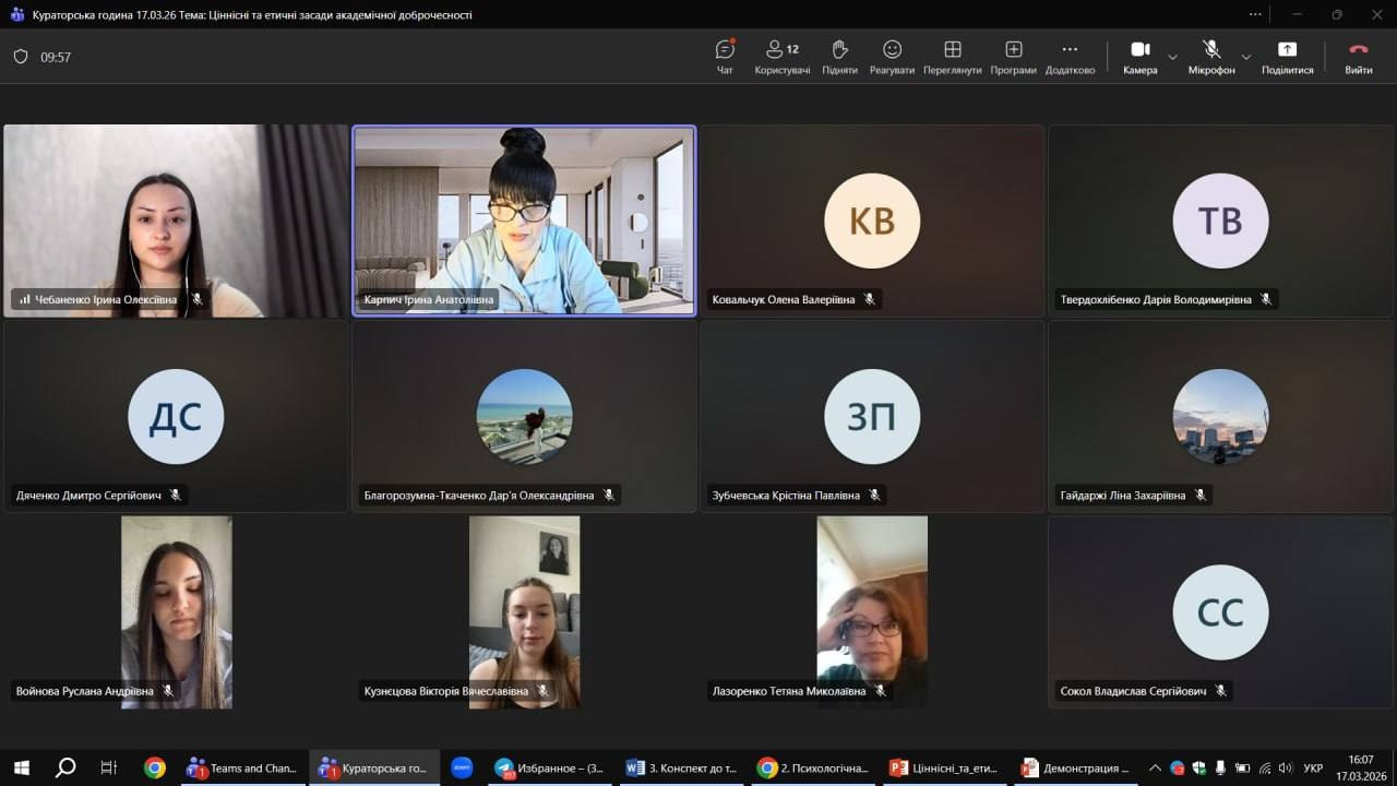 17 березня 2026 року в рамках Тижня доброчесності кафедра теорії та методики практичної психології провела захід «Ціннісні та етичні засади академічної доброчесності» для здобувачів 3 курсу першого (бакалаврського) рівня ОПП «Психологія». Спікерами заходу виступили І.А. Карпич та Т.М. Лазоренко. Під час заходу було розглянуто ціннісні та етичні засади академічної доброчесності як фундамент освітньої та наукової діяльності. У центрі уваги були питання формування моральної культури особистості, що забезпечує довіру до результатів навчання і досліджень, а також значення дотримання принципів доброчесності для професійного становлення майбутніх фахівців. Учасники заходу мали можливість осмислити академічну доброчесність не лише як сукупність правил, а як важливу складову професійної етики, відповідального навчання та особистісного розвитку. Обговорення теми сприяло поглибленню розуміння ролі чесності, відповідальності, поваги до інтелектуальної праці та етичних норм у сучасному освітньому середовищі.