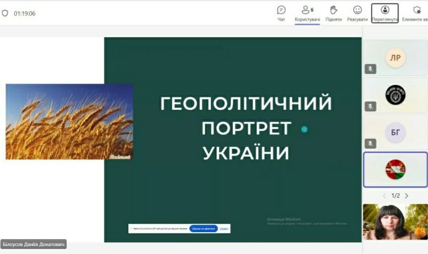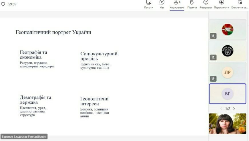 Сьогодні засідання студентського наукового гуртка «Міжнародні відносини та дипломатія» присвячено актуальній науковій та безпековій проблемі – геополітичному становищу України.  Студенти 4 курсу спеціальності «Політологія» представили власні наукові проєкти «Геополітичний портрет України». Аспірант 2 року навчання  спеціальності «Політологія» Микита Лагутін виступив в ролі політичного аналітика та ведучого засідання гуртка.