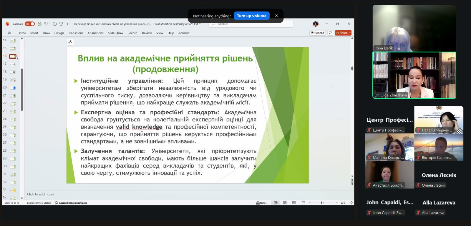 Головний спікер – Ольга Збарська, доктор наук, експерт у галузі розвитку креативного потенціалу людини, член академії ACSW та The Textbook & Academic Authors Association, засновник і президент компанії «OZCREDO», автор численних книг та підручників. У своїй доповіді вона розкрила тему «Вплив когнітивних стилів на ухвалення рішень», акцентуючи увагу на тому, як індивідуальні особливості мислення впливають на ефективність управлінських рішень.