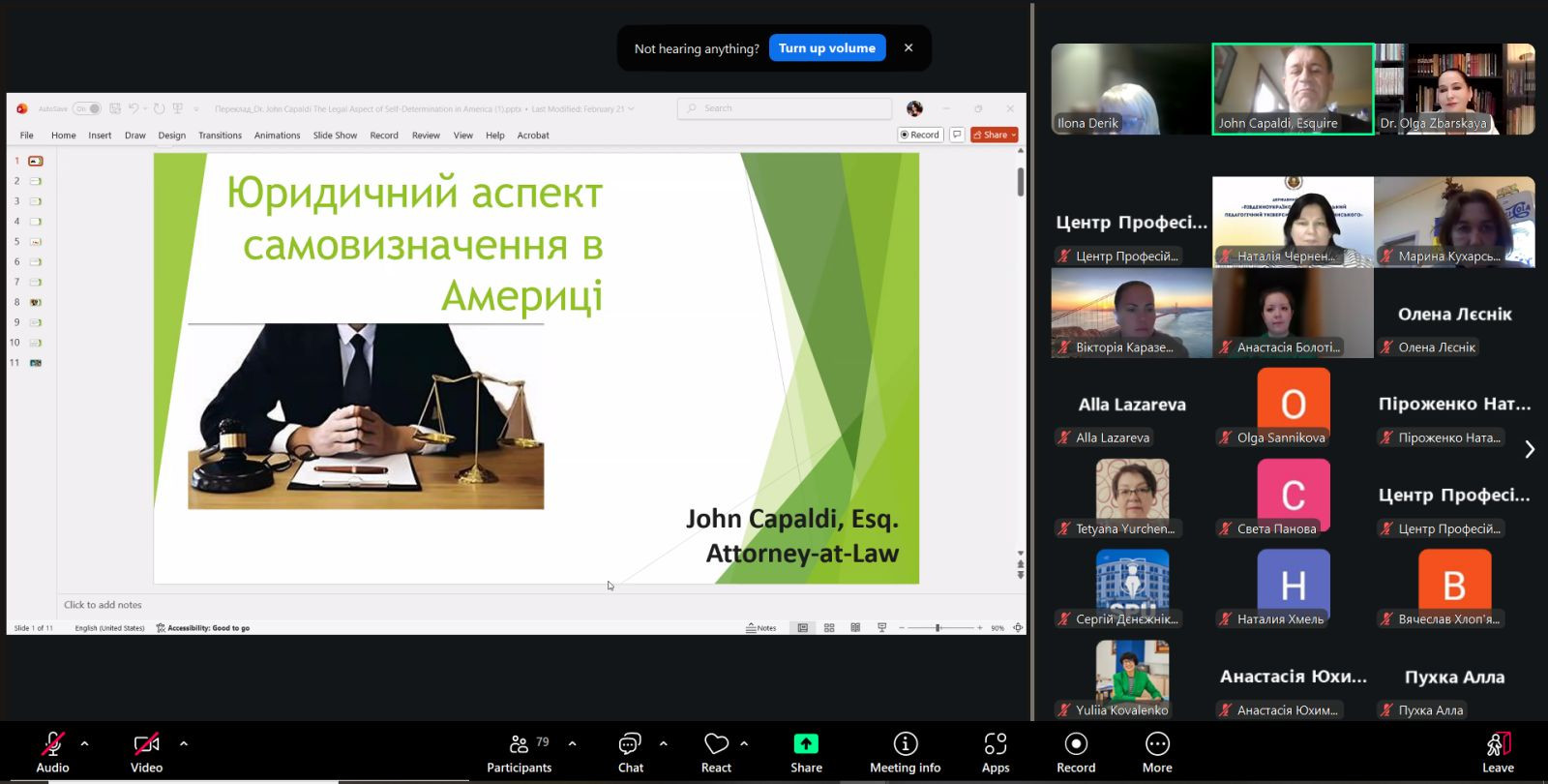 Запрошений гість – Джон Капалді, адвокат із докторським ступенем права та понад 30-річним досвідом роботи, поділився практичними аспектами теми «Юридичний аспект самовизначення в Америці», ґрунтуючись на власному досвіді як професора Темпльського університету, журналіста, власника юридичної контори, інспектора Міністерства фінансів США та помічника міського юриста Філадельфії.
