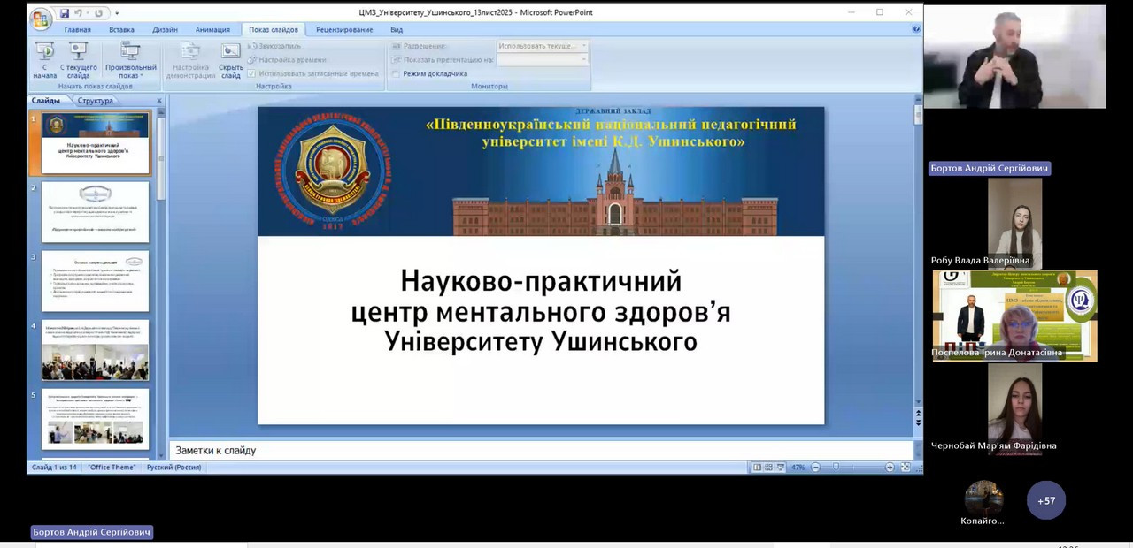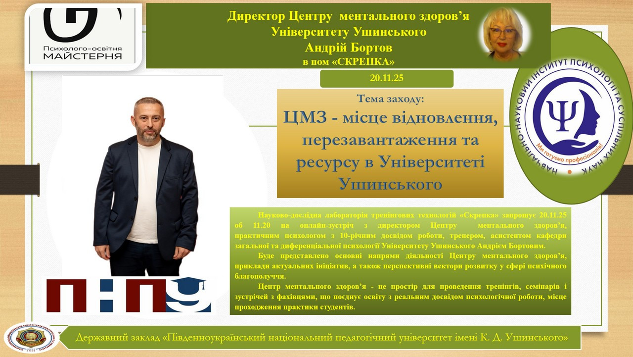 20 листопада до науково-дослідної лабораторії тренінгових технологій «Скрепка», що створена на базі кафедри теорії та методики практичної психології Навчально-наукового інституту психології та суспільних наук Університету Ушинського, завітав на онлайн-зустріч директор Центру ментального здоров’я, практичний психолог з 10-річним досвідом роботи, тренер, асистент кафедри загальної та диференціальної психології Університету Ушинського Андрій Сергійович Бортов.
