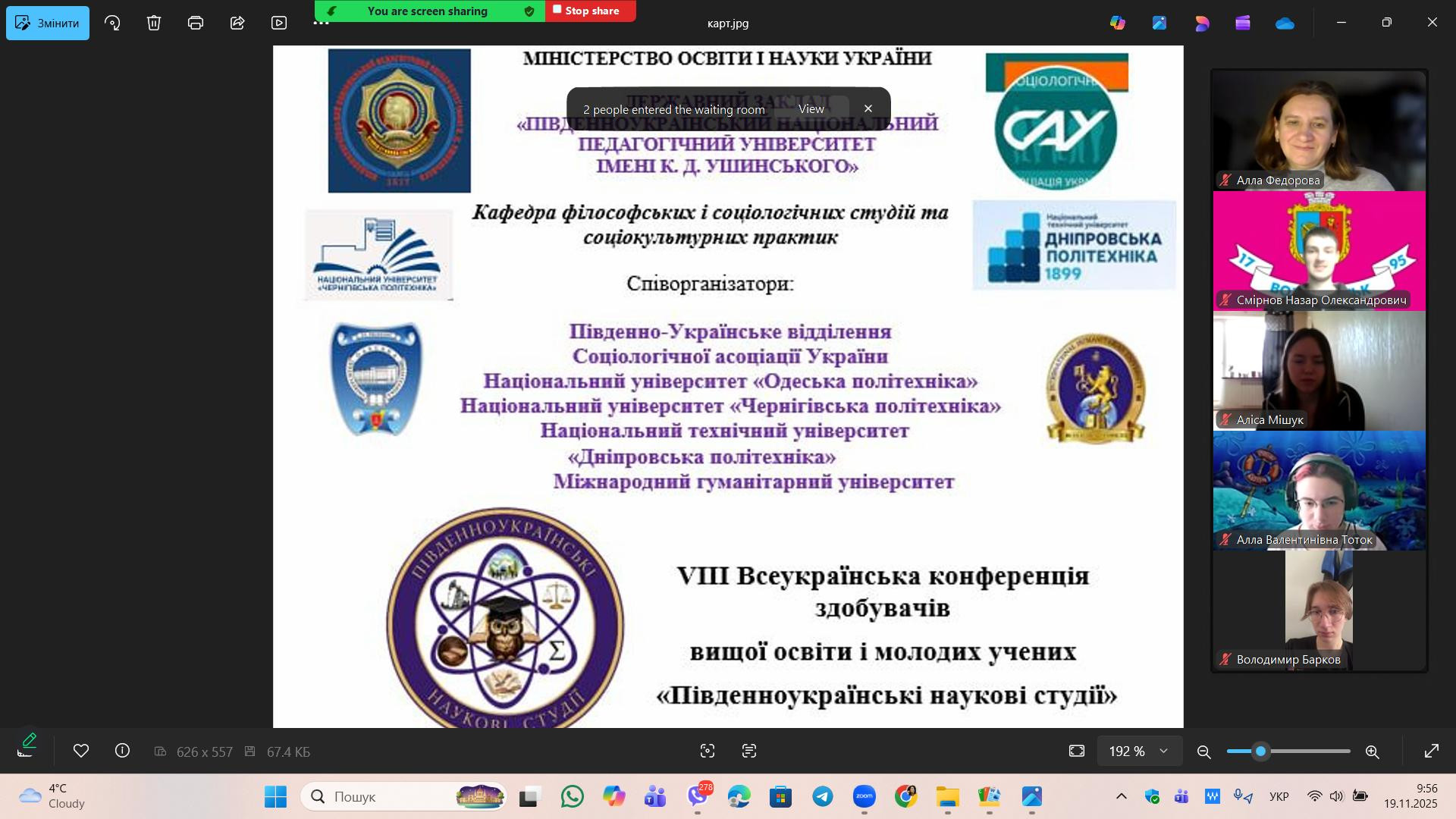 17–19 листопада 2025 року в Університеті Ушинського відбулася одна з найочікуваніших наукових подій академічної осені, яку організувала кафедра філософських і соціологічних студій та соціокультурних практик, – традиційна, вже VIII Всеукраїнська конференція здобувачів вищої освіти і молодих учених «Південноукраїнські наукові студії». Захід відбувся у змішаному форматі та об’єднав активних, допитливих і творчих учасників з усіх куточків України. Серед співорганізаторів: Південно-Українське відділення Соціологічної асоціації України, Національний університет «Одеська політехніка», НУ «Чернігівська політехніка», НТУ «Дніпровська політехніка» та Міжнародний гуманітарний університет. Це були три дні живого інтелектуального спілкування, насичених дискусій і яскравих дослідницьких презентацій. Учасники говорили про те, чим живе сьогодні Україна, її культура, освіта, наука, економіка та суспільство в умовах глобальних змін. Робота конференції охопила ряд тематичних напрямків, серед яких: історія і культура в політичних контекстах, креативні індустрії та соціокультурні практики, політика в українському та європейському вимірі, філософія, критичне мислення й логіка в умовах ХХІ століття та інші. З вітальним словом від ЗВО-партнерів виступила завідувачка кафедри філософії і суспільних наук «Чернігівської політехніки» доц. Наталія Шакун та Голова Південноукраїнського відділення САУ проф. Олена Лісенко. Вони підкреслили важливість таких наукових заходів для формування дослідницької культури здобувачів освіти, розвитку їхньої академічної сміливості та здатності мислити критично й відповідально у складних суспільних процесах. Особливою подією в межах конференції став Батл Етиків та Естетиків, який підготувала доц. Рибка Н. М. («Одеська політехніка») – інтелектуальне змагання, у якому учасники дискутували про роль гуманітарних знань у формуванні сучасного суспільства та представили широкий спектр актуальних і творчих повідомлень, серед яких – знайомство з етикою й естетикою, аналіз функцій естетики в повсякденні, обговорення етичних викликів штучного інтелекту, проблеми евтаназії, роздуми про щастя та художні практики сучасності. Всі учасники долучилися до дискусії та обговорення.