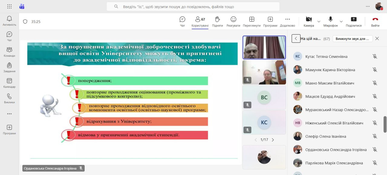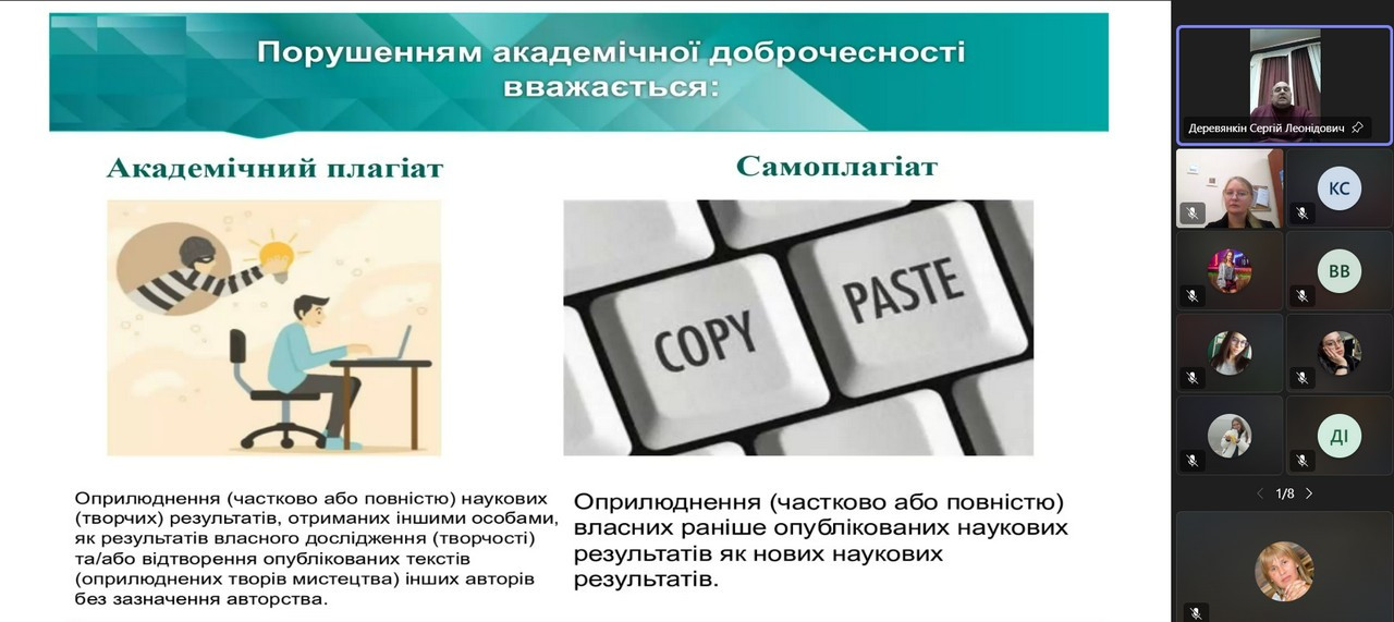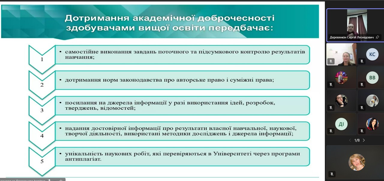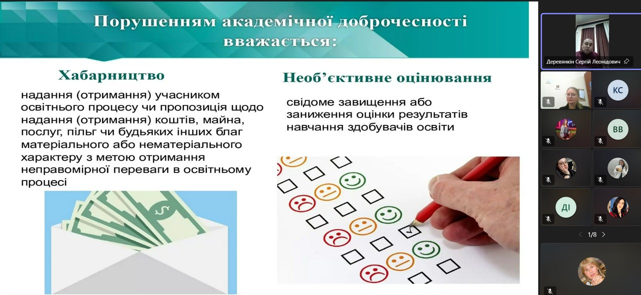 Окремим блоком програми стало питання врегулювання конфліктів інтересів в університетському середовищі. Доцент Деревянкін С. Л. наголосив на важливості дотримання етичних норм і принципів академічної культури всіма учасниками освітнього процесу, розкрив механізми виявлення та врегулювання потенційних конфліктних ситуацій.