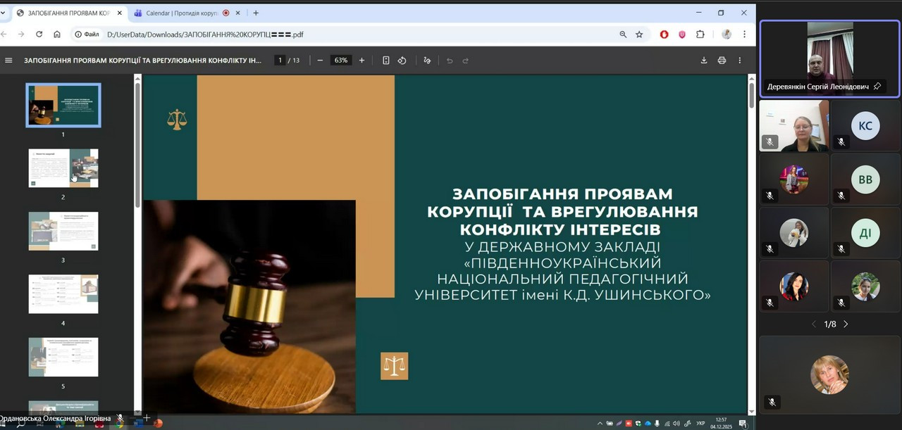 4 грудня 2025 року в навчально-науковому інституті природничо-математичних наук, інформатики та менеджменту за ініціативи в. о. директора інституту професора Олександри Ігорівни Ордановської для здобувачів освіти, викладачів і співробітників було організовано зустріч з керівником уповноваженого підрозділу Університету Ушинського з питань запобігання та протидії корупції, кандидатом юридичних наук, доцентом кафедри політичних наук і права Деревянкіним Сергієм Леонідовичем.
