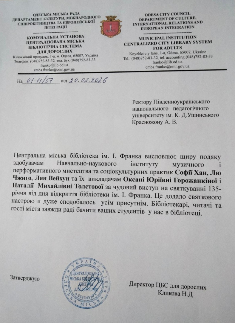 19 лютого 2026 року бібліотека імені Івана Франка відсвяткувала свій поважний 135-річний ювілей. Захід об’єднав відомих науковців, істориків та митців у спільному святкуванні знаменної дати. Справжньою мистецькою прикрасою свята стали виступи талановитих здобувачів Навчально-наукового інституту музичного і перформативного мистецтва та соціокультурних практик, які були підготовлені на базі лабораторії «Сучасні мистецькі студії». Високу виконавську майстерність продемонстрували Соф’я Хан, Лю Чжиго та Лян Вейхун. Їхні професійні виступи подарували глядачам яскраві емоції та створили піднесену атмосферу свята. На урочистості були запрошені почесні гості: директор Археологічного музею І. В. Піструіл, директор Центру «Музеї ОНУ ім. І. І. Мечникова» В. О. Кузнєцов, доктор історичних наук, професор кафедри історії України ОНУ імені І. І. Мечникова В. М. Хмарський, який привітав колектив бібліотеки та передав до її фондів власні видання: «Археографічна діяльність Одеського товариства історії і старожитностей» та «У пошуках гармонії». Особливий погляд на минуле представили студенти-історики ОНУ імені І. І. Мечникова, які підготували сучасний мультимедійний проєкт про історію створення бібліотеки.