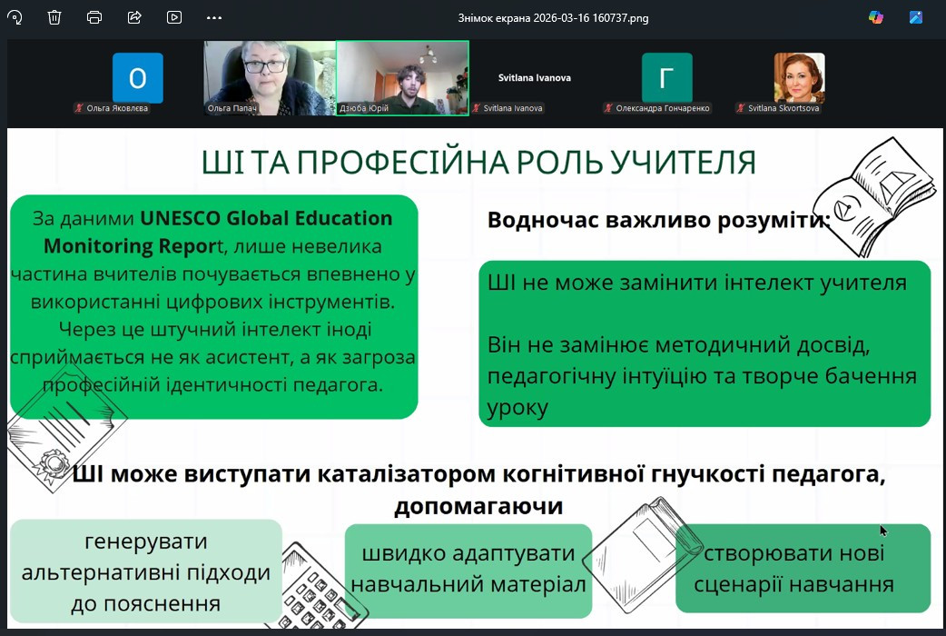 Дискусійна частина воркшопу засвідчила зацікавленість професійної спільноти у використанні ШІ як інтелектуального партнера для генерації варіативних освітніх сценаріїв. Учасниками було відзначено, що інтеграція цифрових інструментів сприяє подоланню когнітивної ригідності не лише учнів, а й самих педагогів, стимулюючи їх до професійної маневреності.
