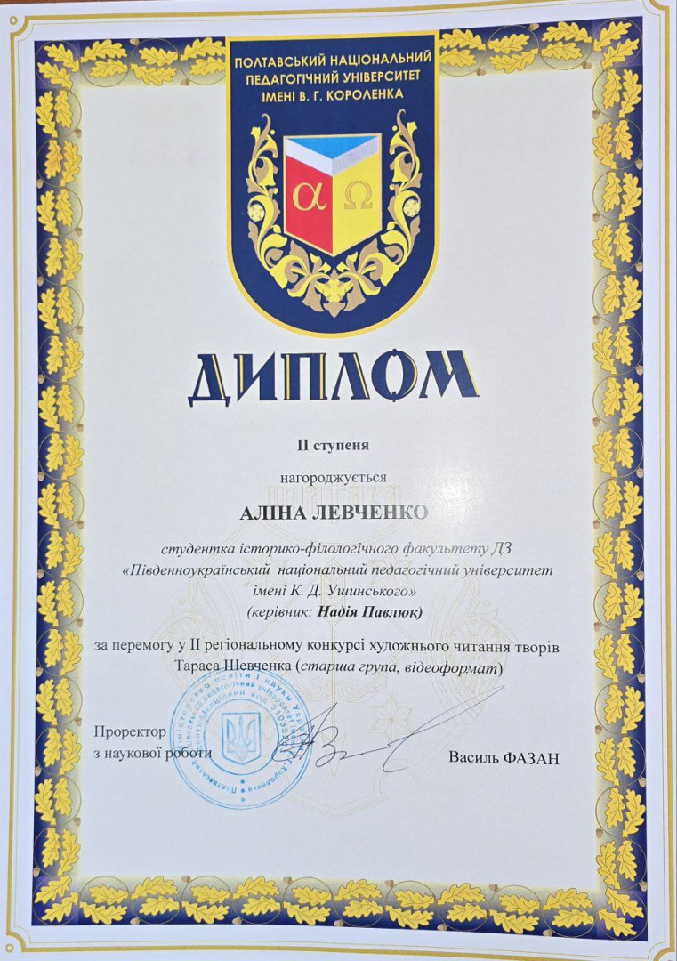 Особливу увагу журі привернув виступ студентки 2 курсу Левченко Аліни, відео якої отримало високу оцінку експертного складу та було нагороджено дипломом ІІ ступеня. Аліна продемонструвала глибоке розуміння поезії, емоційність, сценічну впевненість та здатність передати художній образ твору, що зробило її виступ яскравим і надзвичайно вражаючим.