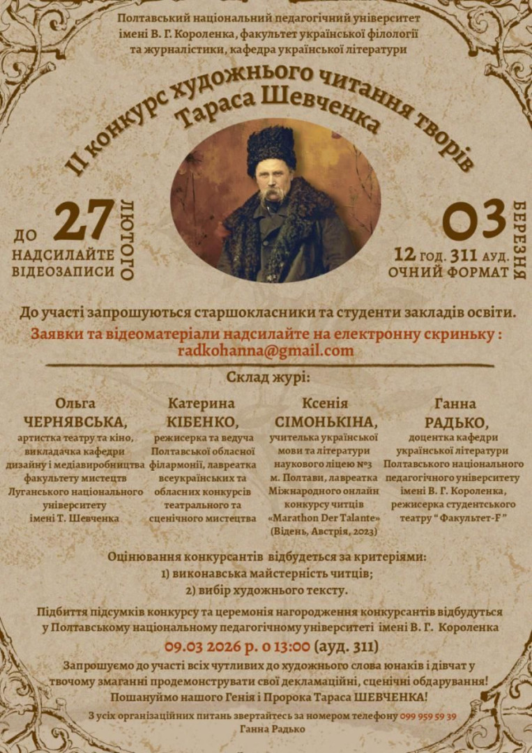 9 березня 2026 року студенти 1–2 курсів історико-філологічного факультету взяли участь у ІІ регіональному конкурсі художнього читання творів Тараса Шевченка, який відбувся в Полтавському національному педагогічному університеті імені В. Г. Короленка. Цей конкурс об’єднав талановиту молодь із різних навчальних закладів України та став важливою платформою для розвитку навичок художнього читання і популяризації творчості Кобзаря серед учнівської та студентської молоді.