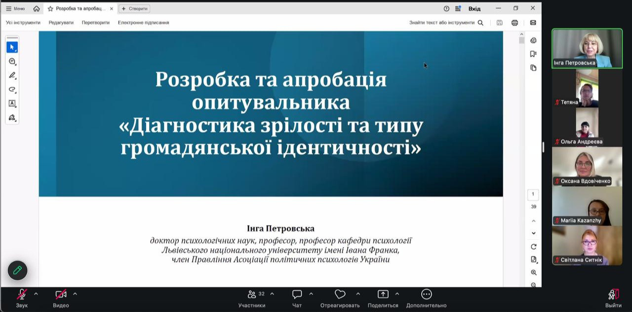 Під час лекції було висвітлено сучасні підходи до вивчення громадянської ідентичності, представлено авторський опитувальник, а також розглянуто особливості його розробки та апробації. Особливу увагу спікерка приділила практичному застосуванню інструменту у психологічних дослідженнях та освітньому процесі.