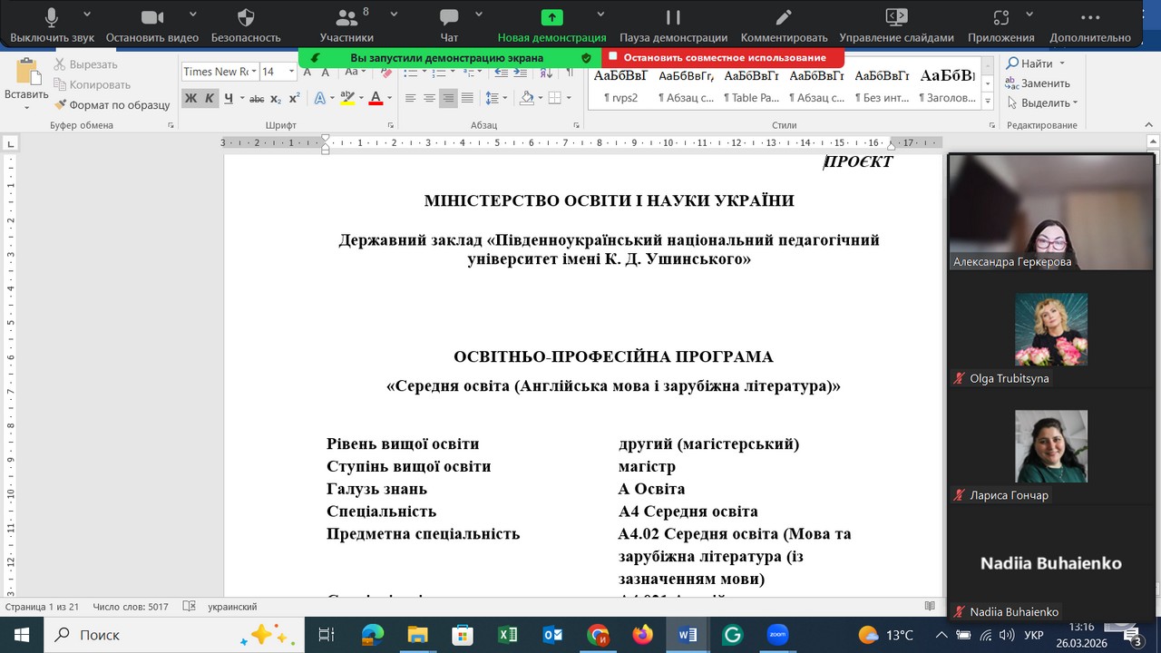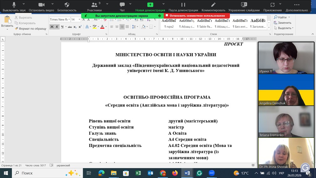 З метою забезпечення відкритості та публічності обговорення освітніх програм, відповідно до розпорядження від 23 березня 2026 року № 8-Р, 26 березня 2026 року на кафедрі германської філології та методики викладання іноземних мов відбулося засідання за участю стейкхолдерів та членів робочих груп освітньо-професійної програми «Середня освіта (Англійська мова і зарубіжна література)» другого (магістерського) рівня вищої освіти.