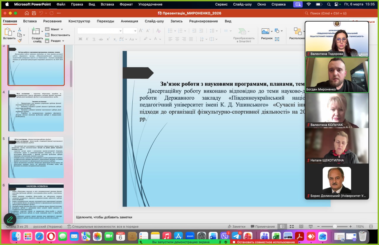 6 березня 2026 року на кафедрі гімнастики та фізкультурно-спортивних технологій відбувся важливий етап підготовки молодого науковця — передзахист дисертації Мироненко Богдана на тему «Фізична підготовка футбольних арбітрів із застосуванням засобів фітнесу», науковий керівник завідувач кафедри гімнастики та фізкультурно-спортивних технологій, професор, д-р пед. наук Долинський Борис.