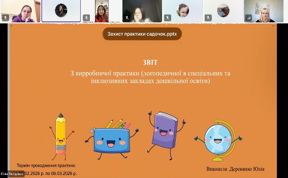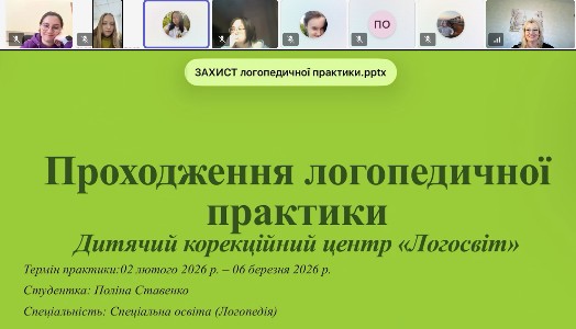 12 березня 2026 року відбулася підсумкова конференція з виробничої практики (логопедичної в спеціальних та інклюзивних закладах дошкільної освіти) здобувачів вищої освіти 1 року навчання освітньо-професійної програми «Спеціальна освіта (Логопедія)» зі спеціальності А6 Спеціальна освіта за другим (магістерським) рівнем вищої освіти денної форми здобуття освіти, яка тривала з 2 лютого 2026 р. по 6 березня 2026 р.