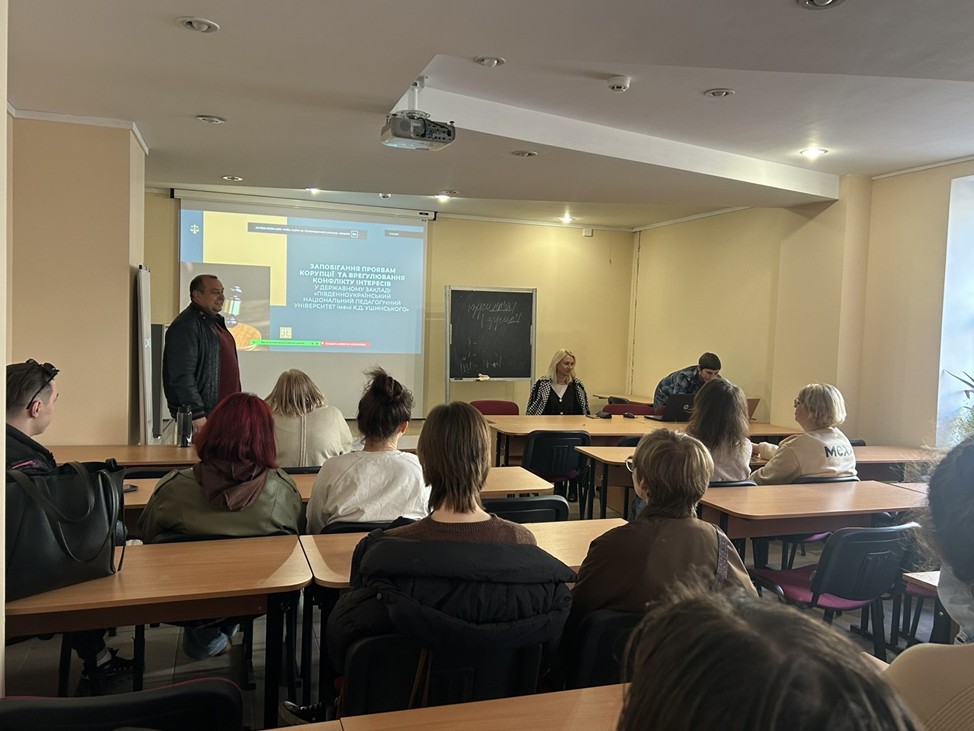 Важливим складником Тижня доброчесності став інформаційно-просвітницький захід антикорупційного спрямування. Спікером зустрічі виступив кандидат юридичних наук, доцент, керівник Уповноваженого підрозділу з питань запобігання та виявлення корупції в Університеті Сергій Деревянкін. У межах доповіді на тему «Запобігання проявам корупції та врегулювання конфлікту інтересів у Державному закладі «Південноукраїнський національний університет імені К.Д. Ушинського»» було розкрито ключові аспекти антикорупційного законодавства, особливості виявлення та попередження конфлікту інтересів, а також окреслено практичні механізми забезпечення академічної доброчесності в освітньому середовищі.